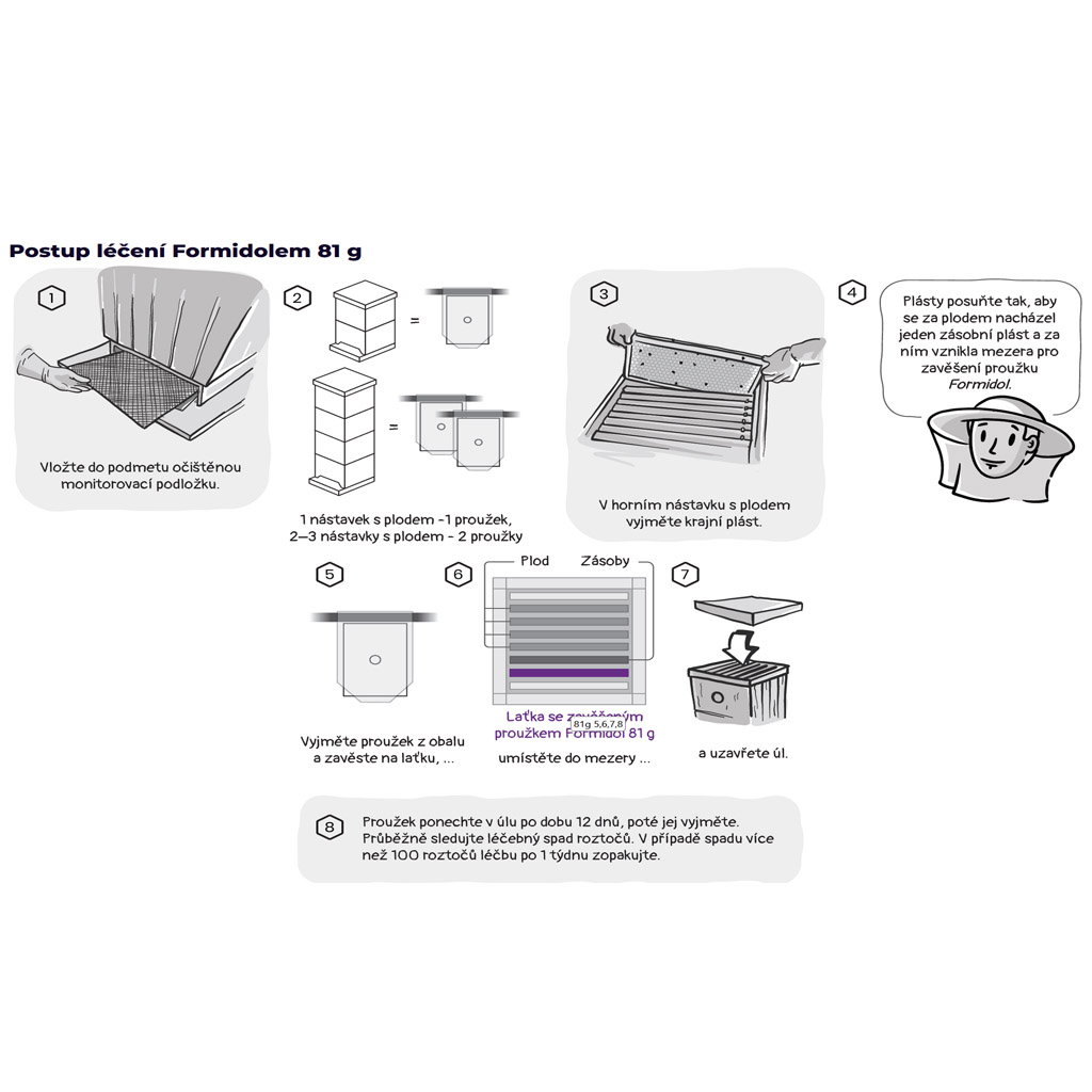 La tavoletta evaporante con acido formico è destinata al trattamento estivo degli alveari. Se le temperature massime giornaliere superano i 25°C, non inserire o rimuovere l'involucro regolatore nel pomeriggio, quando la temperatura e l'attività dell'entrata sono al massimo, ma al mattino o alla sera dopo che l'arnia si è calmato.