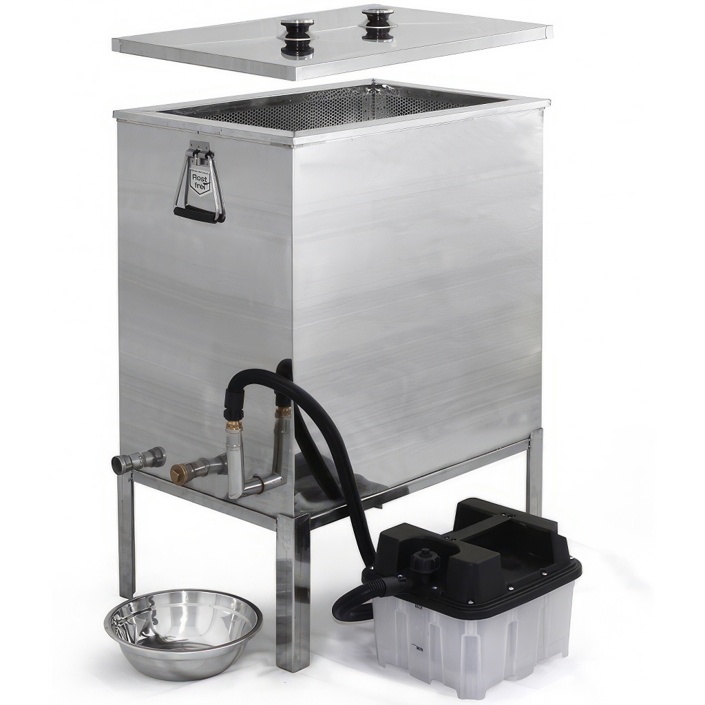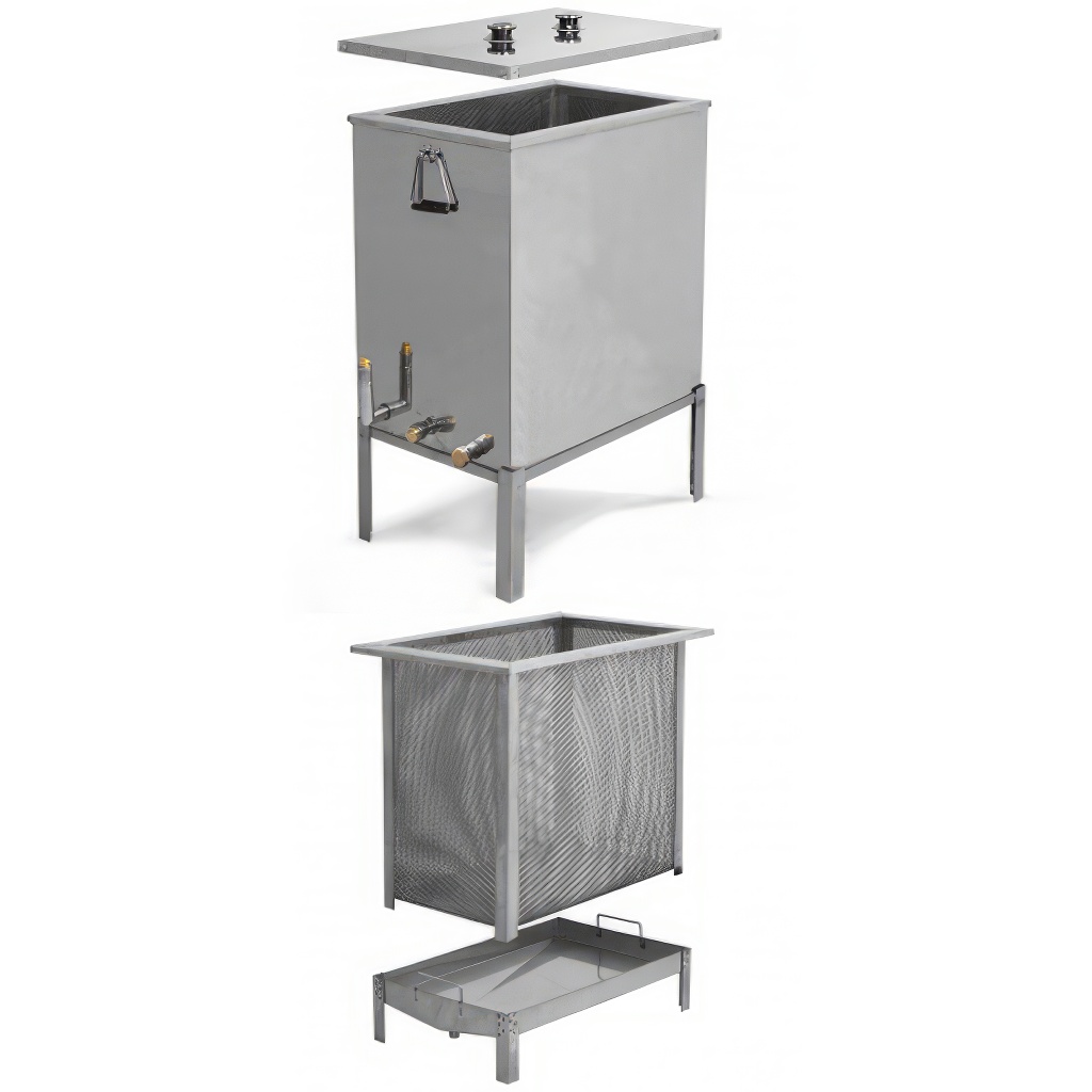Grande scioglitore - scioglitore di cera in acciaio inox + generatore di vapore. Lo scioglitore è progettato per fondere facilmente e rapidamente la cera dai telaini o dai favi utilizzando il vapore acqueo che viene riscaldato dal generatore di vapore incluso nell'apparecchio. Lo scioglitore di cera in acciaio inox a vapore è composto da un serbatoio per l'acqua e da un cestello per i telaini o i favi. Lo scioglitore ha una base stabile a 4 piedi e un cestello per telaini con maniglie. L'acqua defluisce attraverso un proprio foro di scarico, così come la cera. Include anche 3 tappi in ottone e il contenitore può essere utilizzato anche per il lavaggio e la disinfezione
