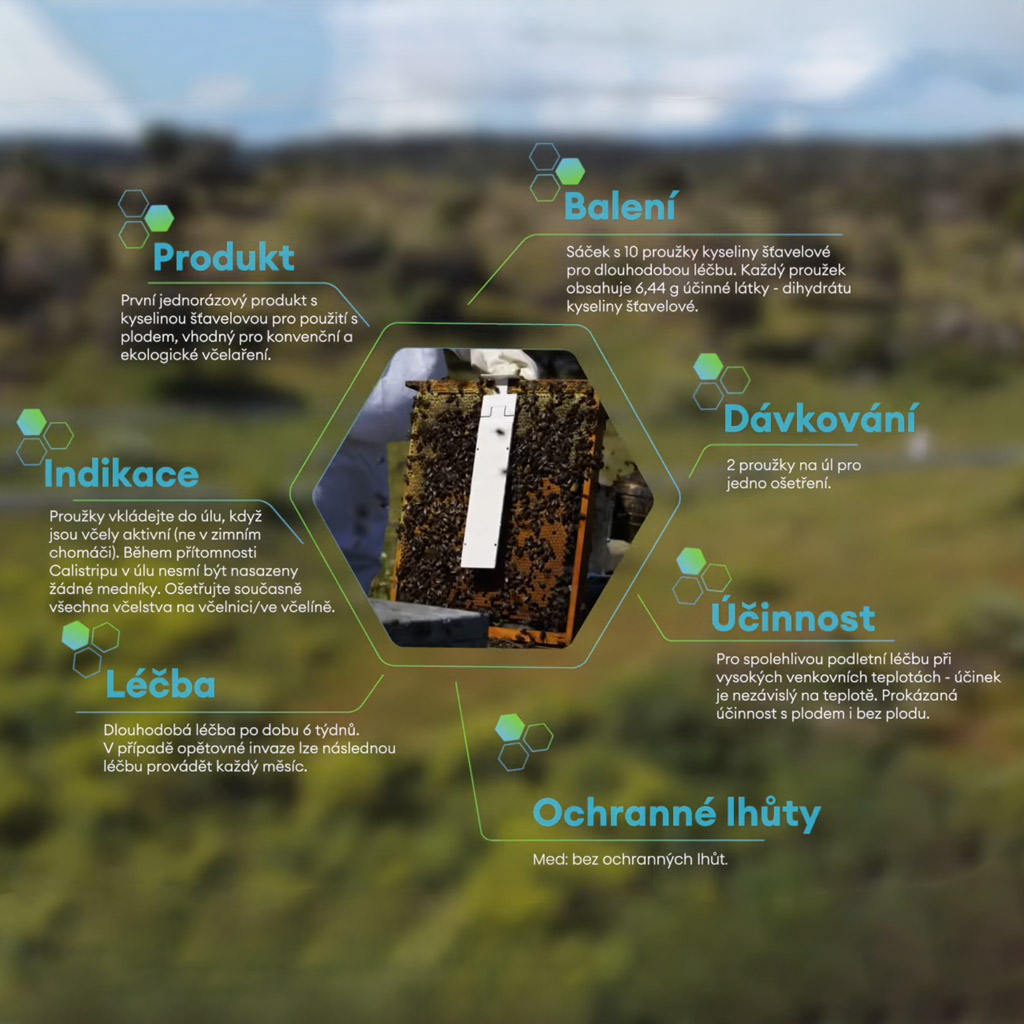 Calistrip® Biox è un moderno preparato veterinario certificato destinato al controllo dell'acaro dell'ape (Varroa destructor). Utilizza una speciale matrice a rilascio graduale di acido ossalico diidrato, grazie alla quale offre un trattamento efficace delle colonie rispettando l'attività naturale dell'arnia. Il preparato è approvato per l'uso nell'UE ed è una scelta adatta per l'apicoltura convenzionale ed ecologica (BIO) – senza rischi inutili per la qualità del miele.