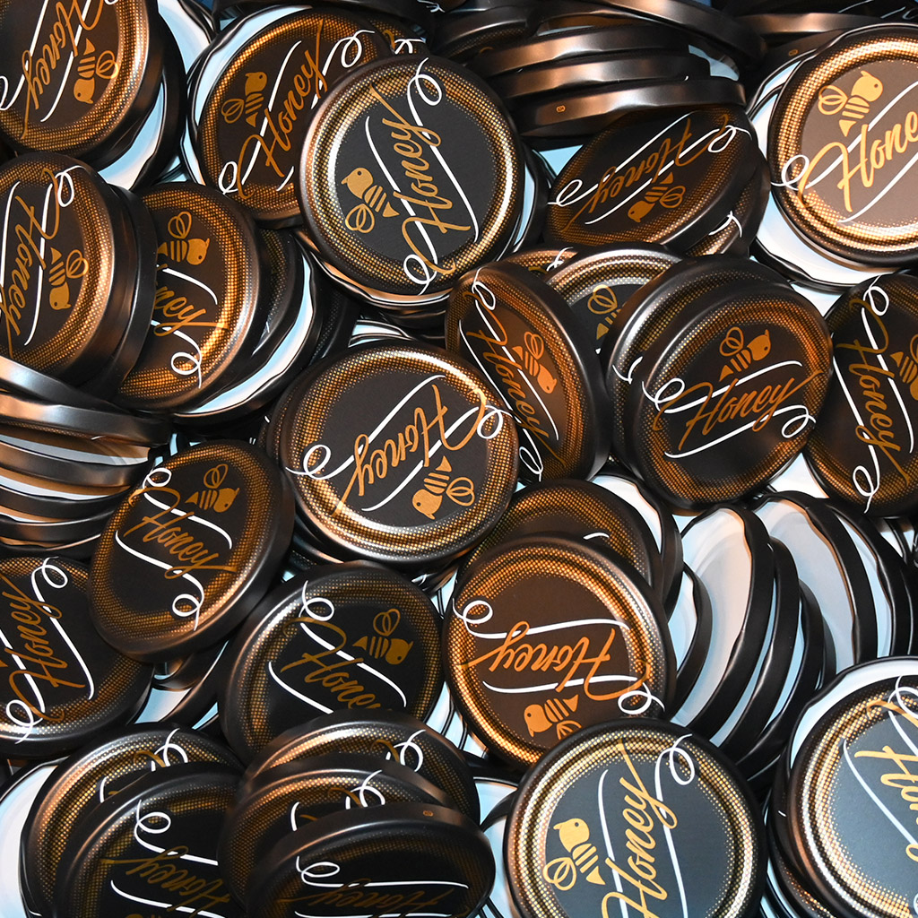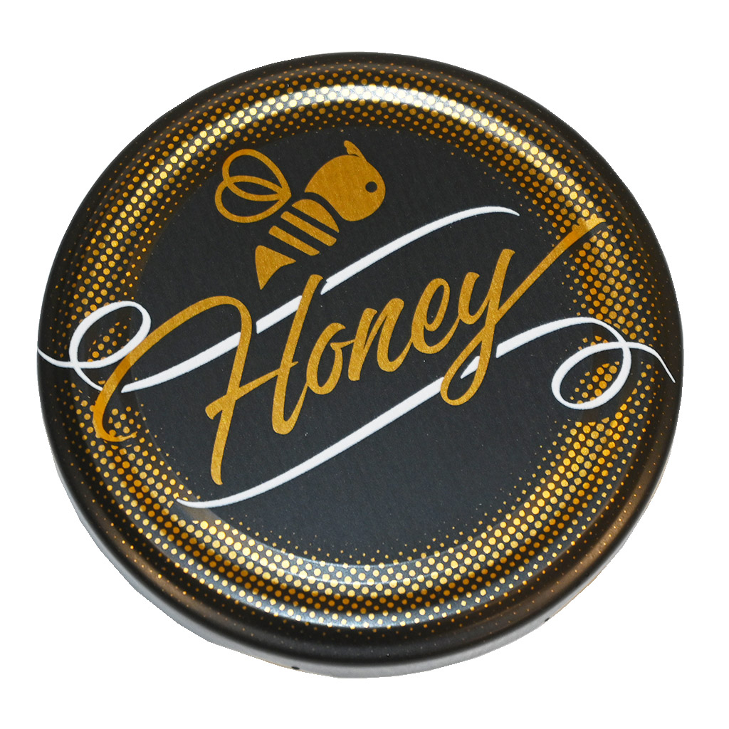 Coperchio a vite modello Honey - nero - opaco - HO12-2 per vasetti Včela 730 ml, Facette 720 ml, Fass 720 ml, Facette 580 ml e Facette 420 ml. Coperchio graficamente molto ben realizzato per vasetti standard, che vengono utilizzati per il miele estratto. Con questo coperchio non farete sicuramente brutta figura con il vostro miele. La confezione completa contiene 700 pezzi.