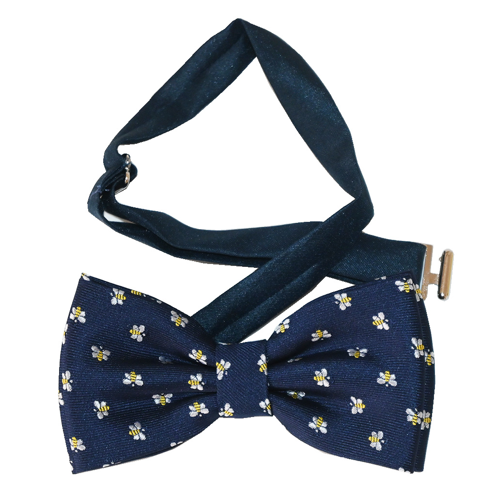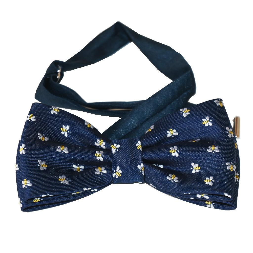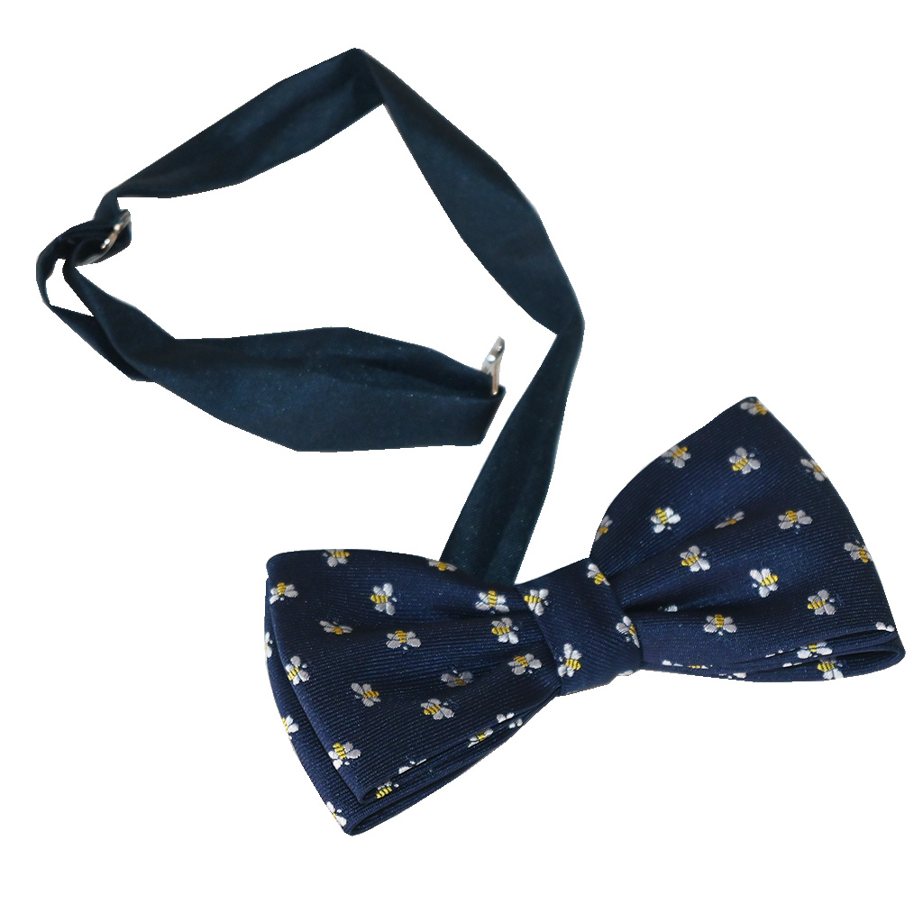 Papillon blu scuro con api ricamate, realizzato in poliestere. Cinturino regolabile per il collo fino a 54 cm, larghezza circa 11,5 cm, altezza 6 cm.