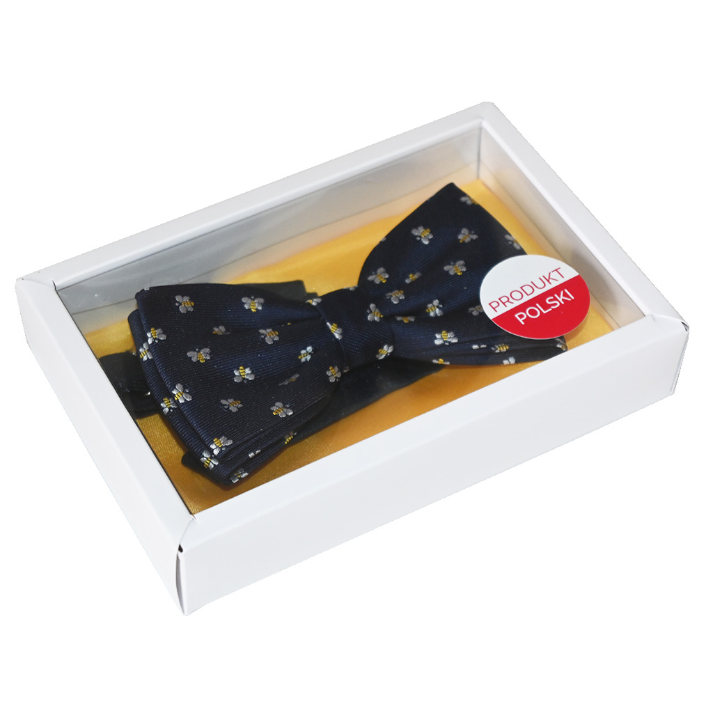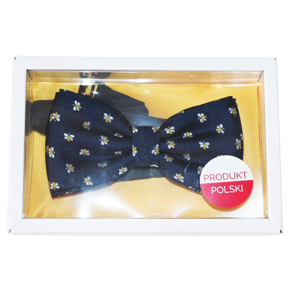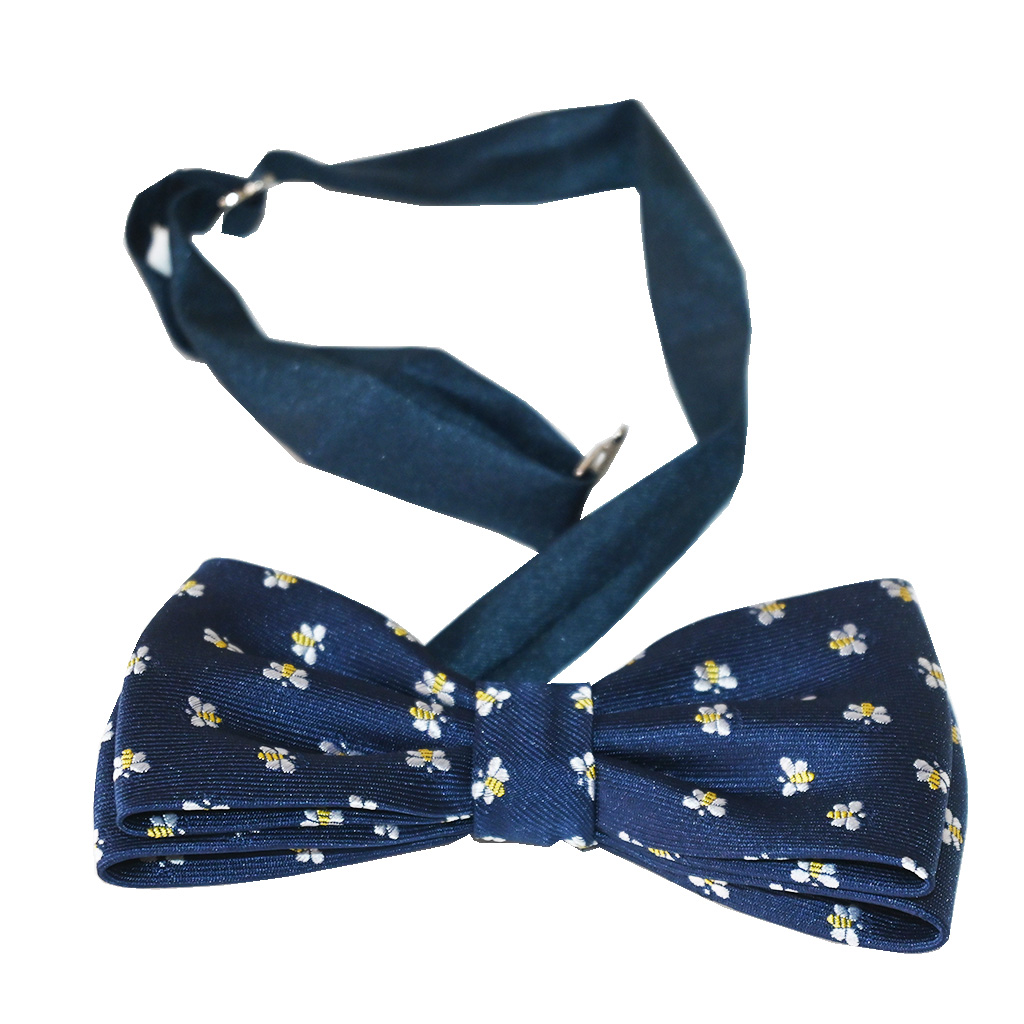 Papillon blu scuro con api ricamate, realizzato in poliestere. Cinturino regolabile per il collo fino a 54 cm, larghezza circa 11,5 cm, altezza 6 cm.