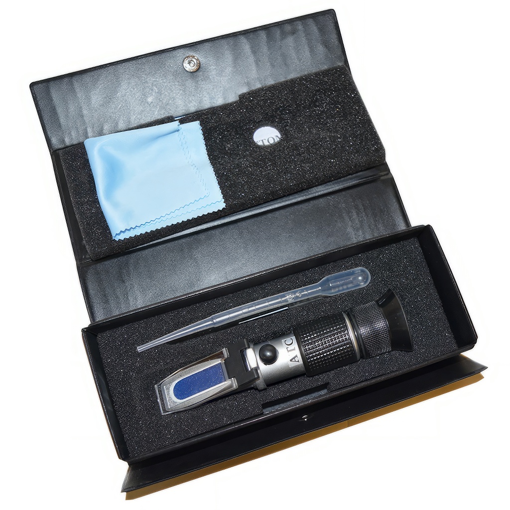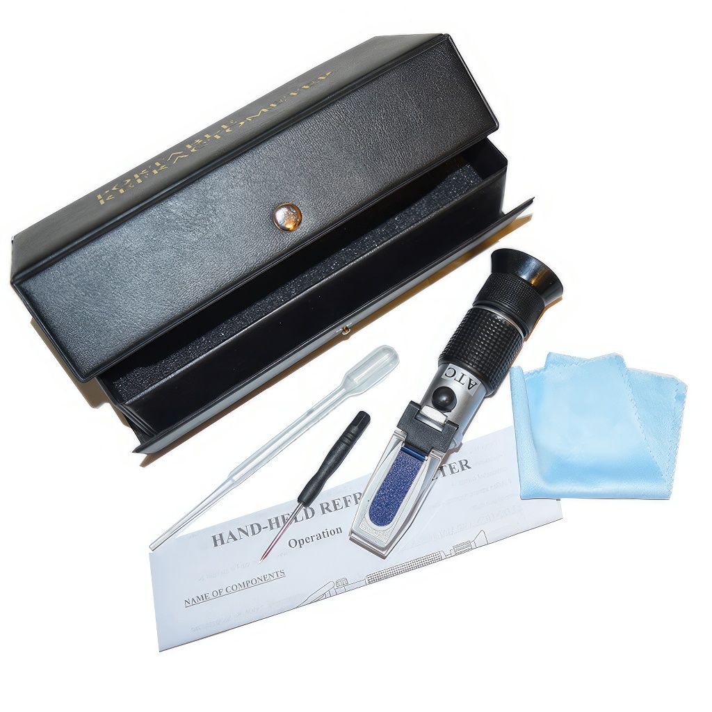 Il rifrattometro è uno strumento ottico di precisione, quindi merita un trattamento delicato. Dopo ogni misurazione sciacquate il prisma con acqua tiepida, asciugate delicatamente con un panno morbido. Non sciacquate lo strumento sotto l'acqua corrente e non immergetelo – l'acqua potrebbe entrare nella parte ottica. Il rifrattometro è solitamente calibrato dalla fabbrica. Il liquido di calibrazione non è incluso nella confezione, ma per l'uso normale generalmente non ne avete bisogno fin dall'inizio.
