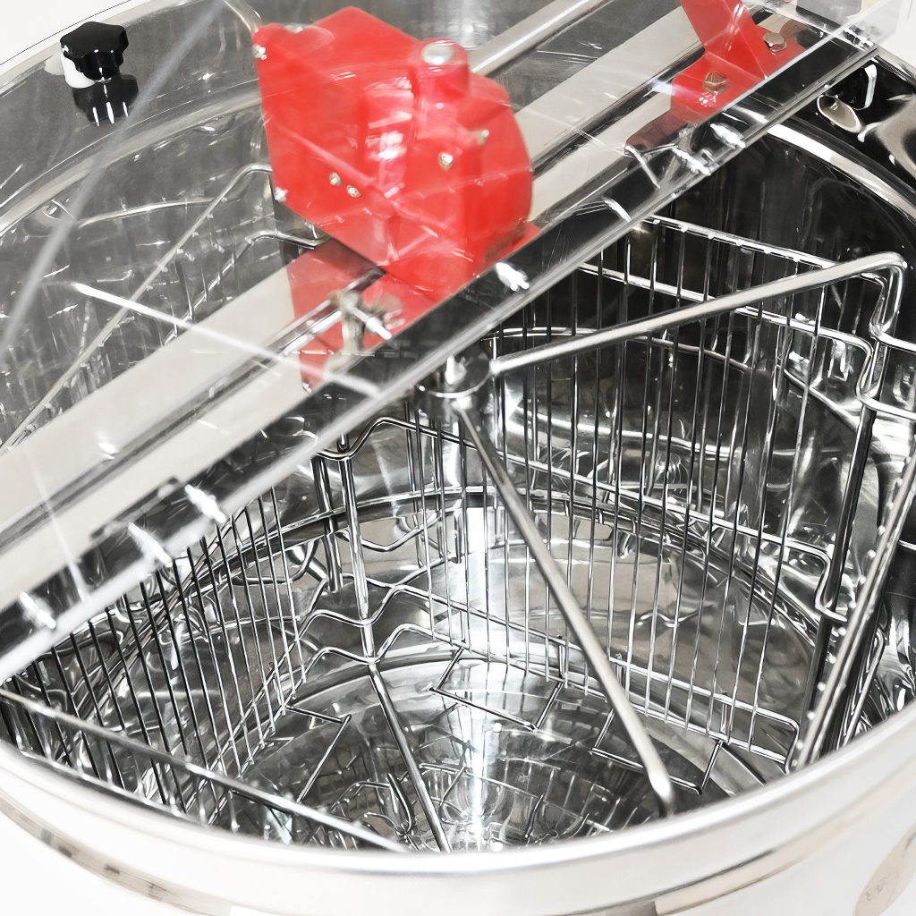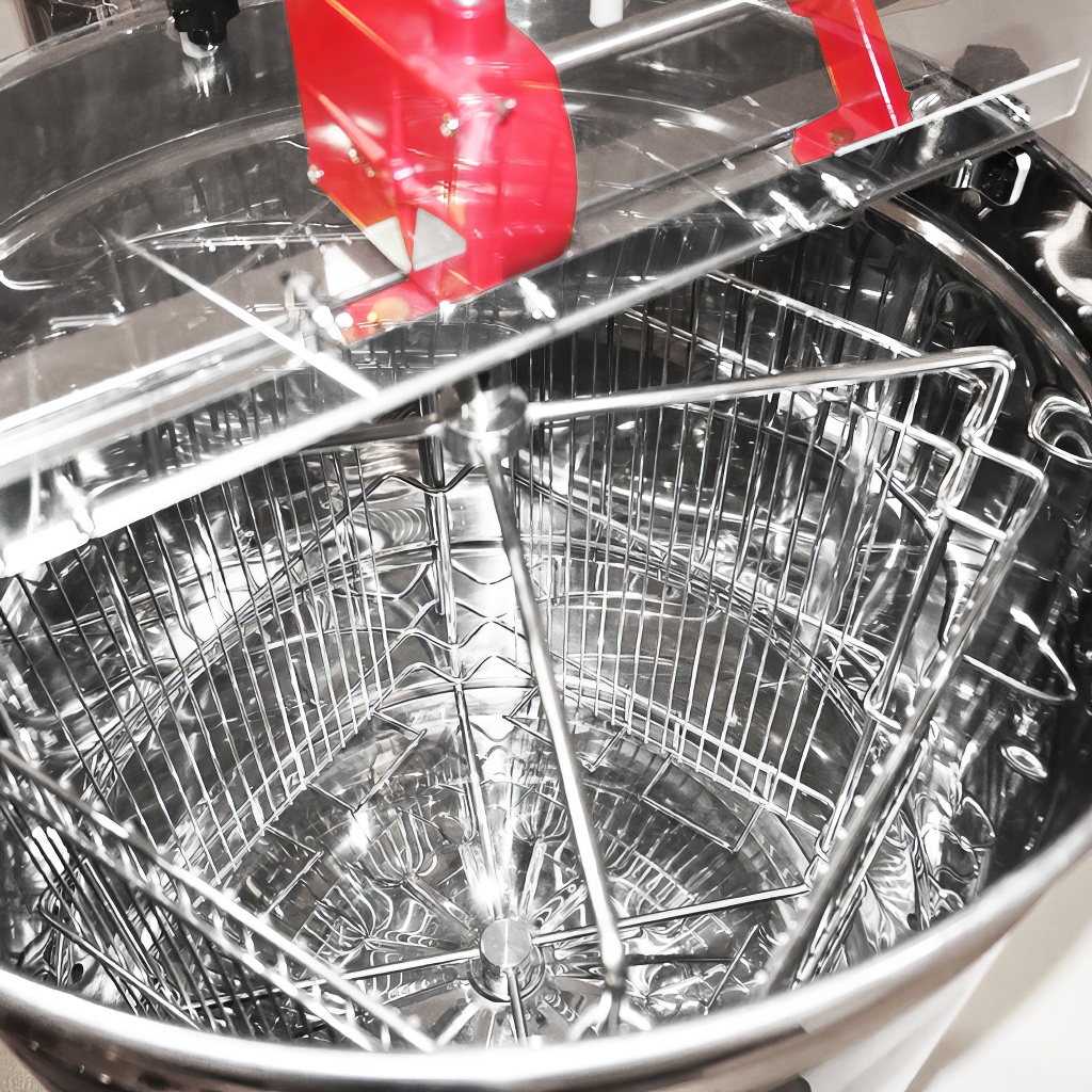 Smelatore tangenziale a quattro telaini con azionamento manuale, dotato di ruota libera e freno. La larghezza del cestello è di 30 cm, quindi lo smelatore è adatto alla maggior parte dei telaini. Lo smelatore è realizzato in lamiera inossidabile lucidata, conforme agli standard per il contatto con gli alimenti. Esecuzione di alta qualità con fondo conico e molti altri elementi innovativi. Questo smelatore è dotato di un cestello senza albero, quindi è possibile ruotare facilmente i telaini direttamente nel cestello senza doverli rimuovere.