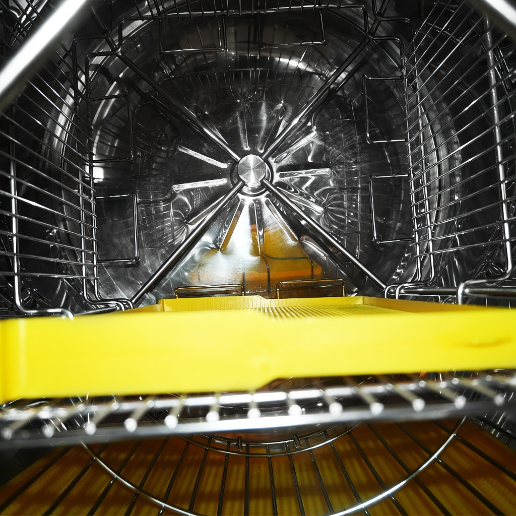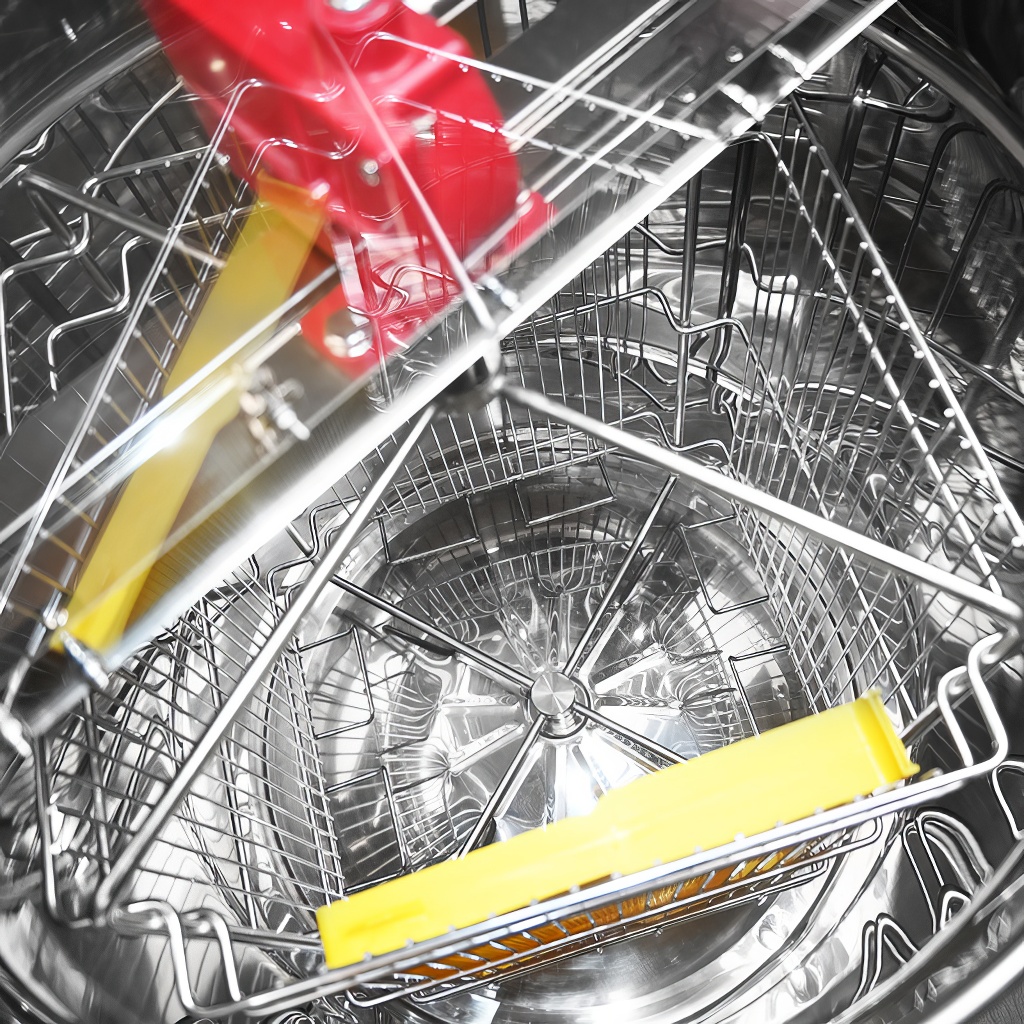 Smelatore tangenziale a quattro telaini con azionamento manuale, dotato di ruota libera e freno. La larghezza del cestello è di 30 cm, quindi lo smelatore è adatto per la maggior parte dei telaini. Lo smelatore è realizzato in lamiera di acciaio inox lucidato, conforme alle certificazioni per il contatto con gli alimenti. Design di alta qualità con fondo conico e molti altri elementi innovativi. Questo smelatore è dotato di un cestello senza albero, quindi i telaini possono essere semplicemente ruotati direttamente nel cestello senza doverli rimuovere.
