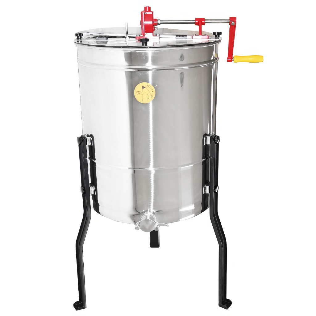 Smielatore tangenziale a quattro telaini con azionamento manuale, dotato di ruota libera e freno. La larghezza del cestello è di 30 cm, quindi lo smielatore è adatto alla maggior parte dei telaini. Lo smielatore è realizzato in lamiera di acciaio inossidabile lucidato, conforme alle certificazioni per il contatto con gli alimenti. Versione di alta gamma con fondo conico e molti altri elementi innovativi. Questo smielatore è dotato di un cestello senza albero, quindi i telaini possono essere semplicemente ruotati direttamente nel cestello senza doverli rimuovere.