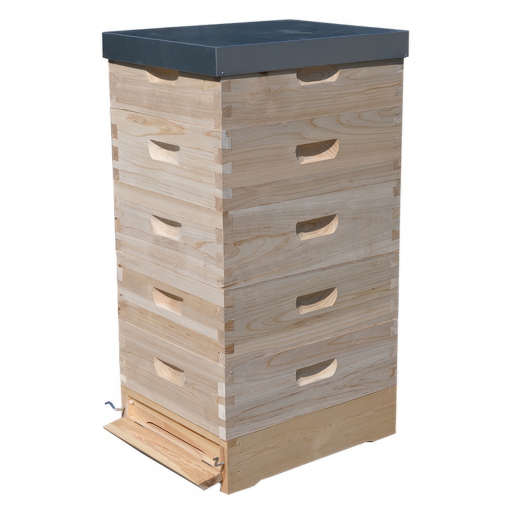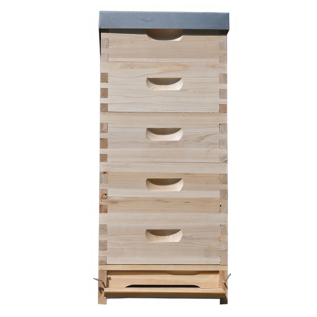 L'arnia completa Langstroth è composta da un fondo antivarroa Langstroth (altezza 10 cm), 5 melari Langstroth 2/3 e un coperchio. Si tratta di una struttura in legno non coibentata. I melari vengono forniti smontati (facili da assemblare) e non hanno la porticina di volo (può essere forata a piacere secondo le vostre esigenze).