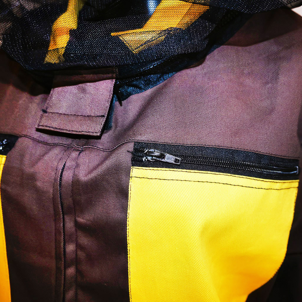 La casacca è realizzata in tessuto rigido di cotone resistente, che mantiene bene la forma e costituisce un'efficace barriera contro i pungiglioni durante la normale manipolazione delle api. Il cappello protettivo è collegato alla casacca tramite una cerniera rimovibile – durante le pause potete quindi rimuoverlo facilmente senza dover togliere l'intero indumento. Nella zona del collo sono presenti elementi protettivi aggiuntivi per una maggiore sicurezza in una delle parti più sensibili del corpo.
