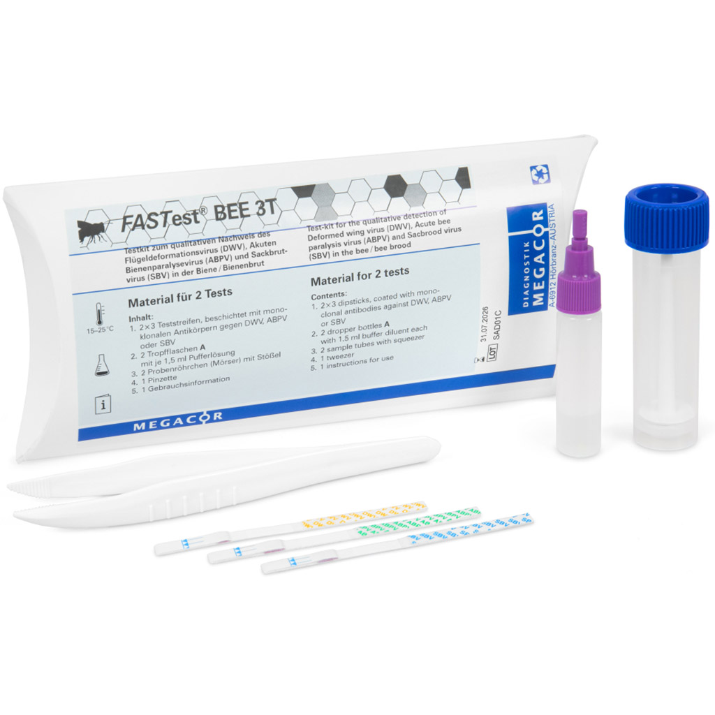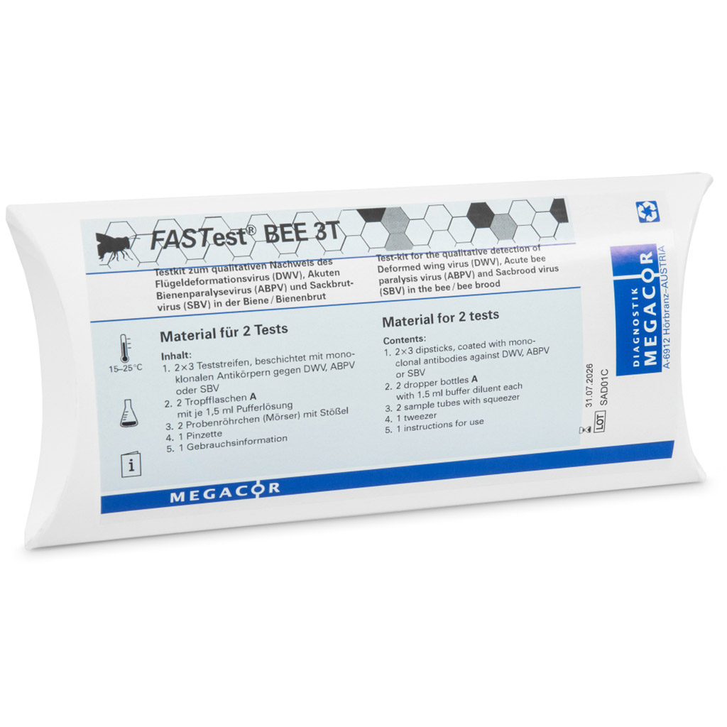Per la stima e la limitazione di queste mortalità invernali, la rilevazione diretta dei virus sul posto tramite FASTest® BEE 3T rappresenta per gli apicoltori uno strumento diagnostico rapido e semplice. In caso di risultato positivo si possono avviare immediatamente misure profilattiche (ad es. controllo della varroasi).