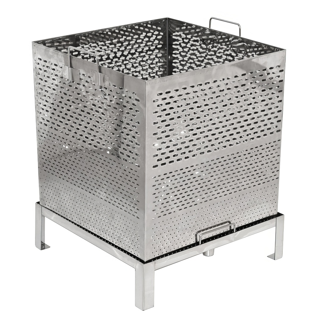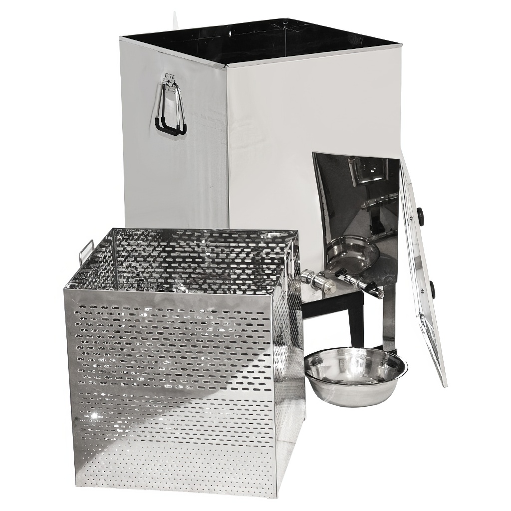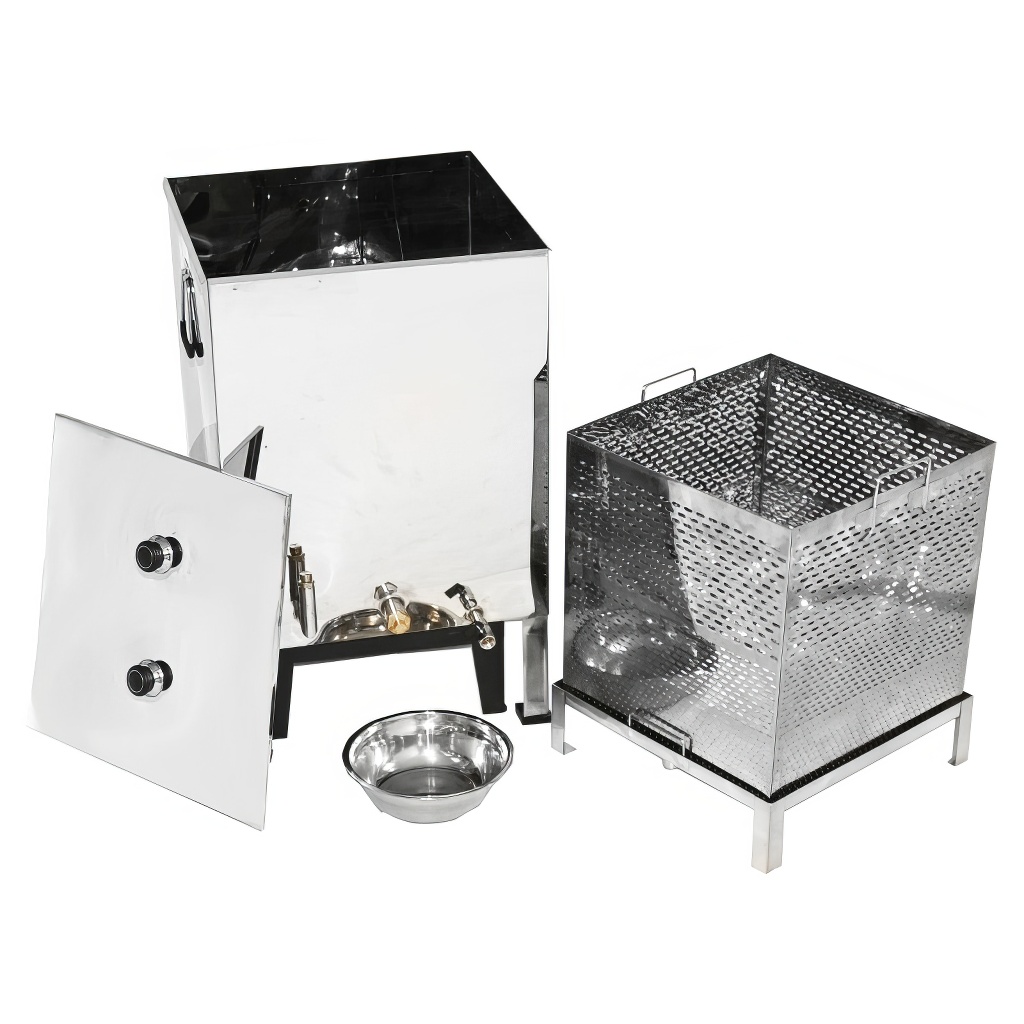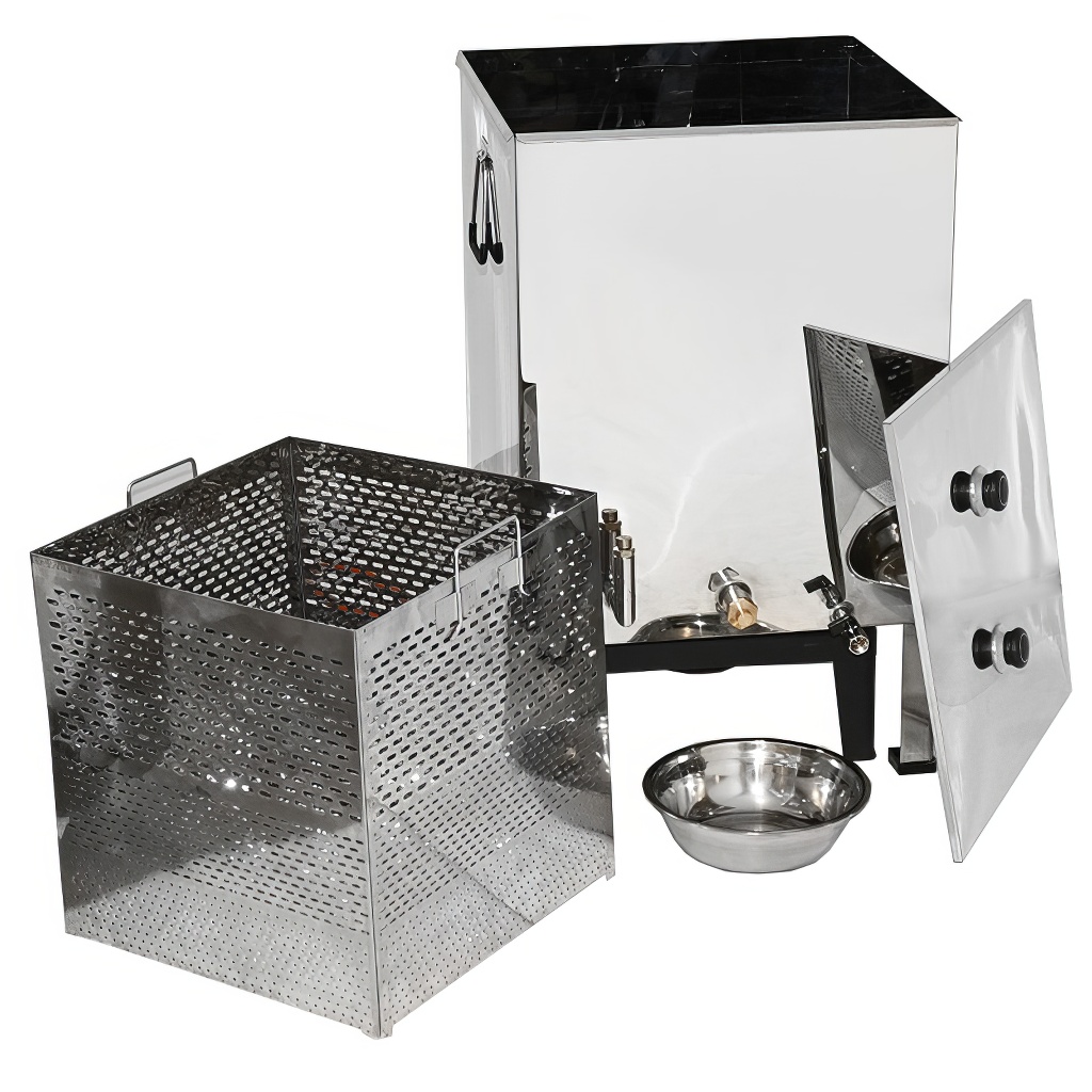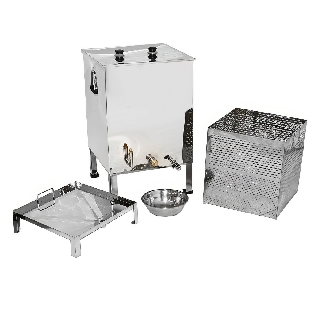 Scioglicera di qualità di grandi dimensioni progettato per fondere facilmente e rapidamente la cera dai telaini e dai favi utilizzando vapore acqueo, che può essere riscaldato sia con un generatore di vapore che con un fornello a gas. Il fondicera in acciaio inox a vapore è composto da un serbatoio per l'acqua e da un cestello per i telaini o i favi. Lo scioglicera ha una base stabile a 4 gambe e un cestello per telaini con maniglie. L'acqua e la cera defluiscono attraverso i rispettivi fori di scarico.