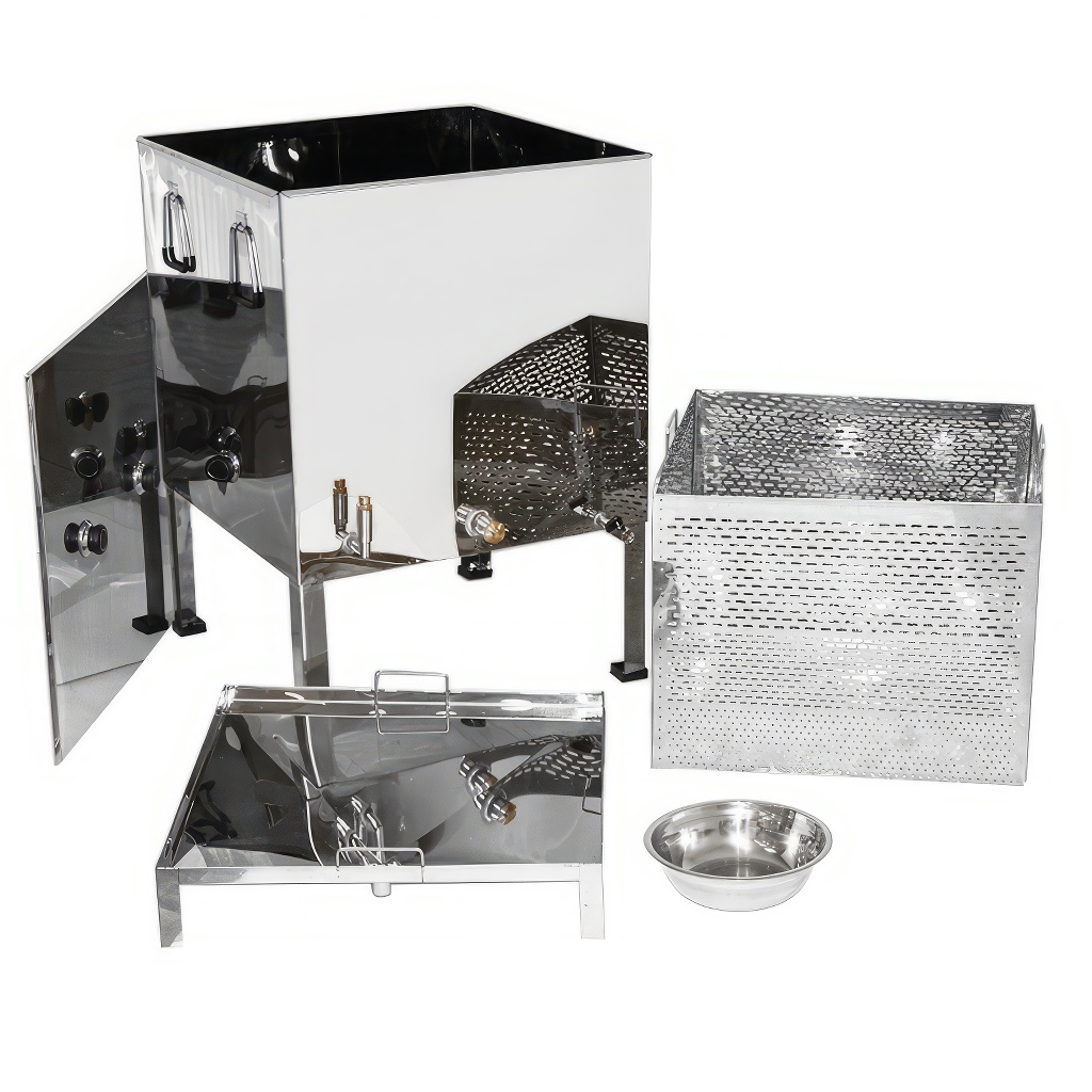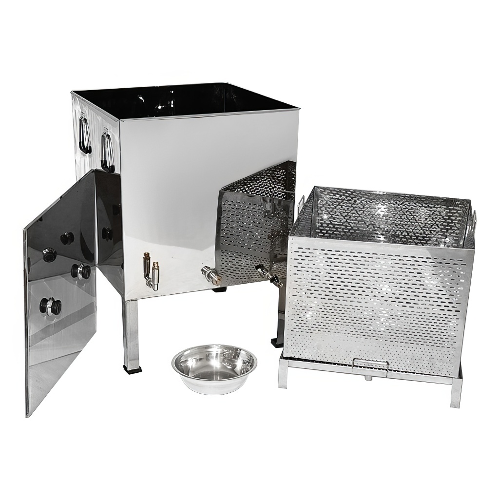 Bollitore di cera di qualità e di grandi dimensioni progettato per una facile e rapida estrazione della cera dai telaini e dai favi vuoti utilizzando vapore acqueo, che può essere riscaldato sia con un generatore di vapore che con un fornello a gas.