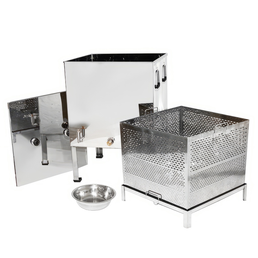 La cera d'api di qualità è la base per ulteriori lavori in apicoltura – sia che vogliate purificarla per la vendita, sia che vogliate produrre fogli cerei. Il fonditore a vapore per cera Mellarius nelle dimensioni 62 × 62 cm è progettato per apicoltori che necessitano di lavorazione rapida, alta resa e costruzione resistente per l'uso quotidiano. Potete fondere direttamente dai telaini e dai favi vecchi, senza inutili tempi morti. Il riscaldamento può essere risolto sia con generatore di vapore esterno che con fornello a gas – a seconda di quello che avete a disposizione in laboratorio, nel laboratorio del miele o all'esterno nell'apiario.