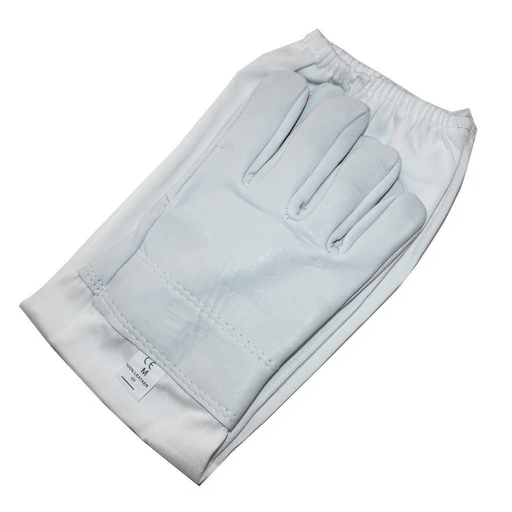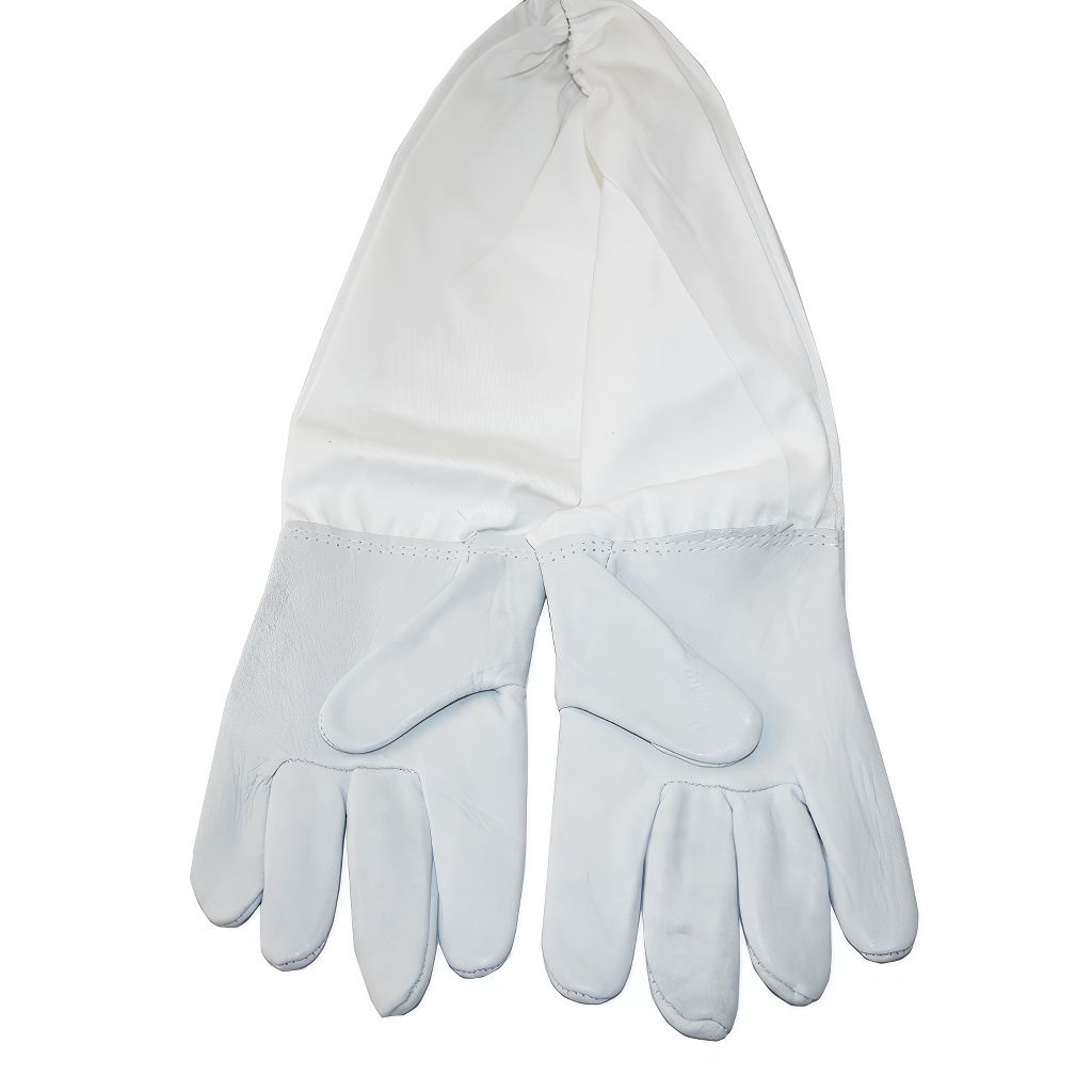 I guanti proteggono non solo i palmi e le dita, ma anche l'area del polso e parte dell'avambraccio, dove le api spesso cercano di trovare un varco sotto l'abbigliamento. La parte in pelle si collega fluidamente al manicotto melarioto in robusto tessuto di cotone, che è resistente e allo stesso tempo traspirante. Le estremità dei manicotti sono strette con elastico (gommino), in modo da aderire bene alla mano o alla manica della tuta e aiutare a prevenire l'ingresso delle api sotto la manica.