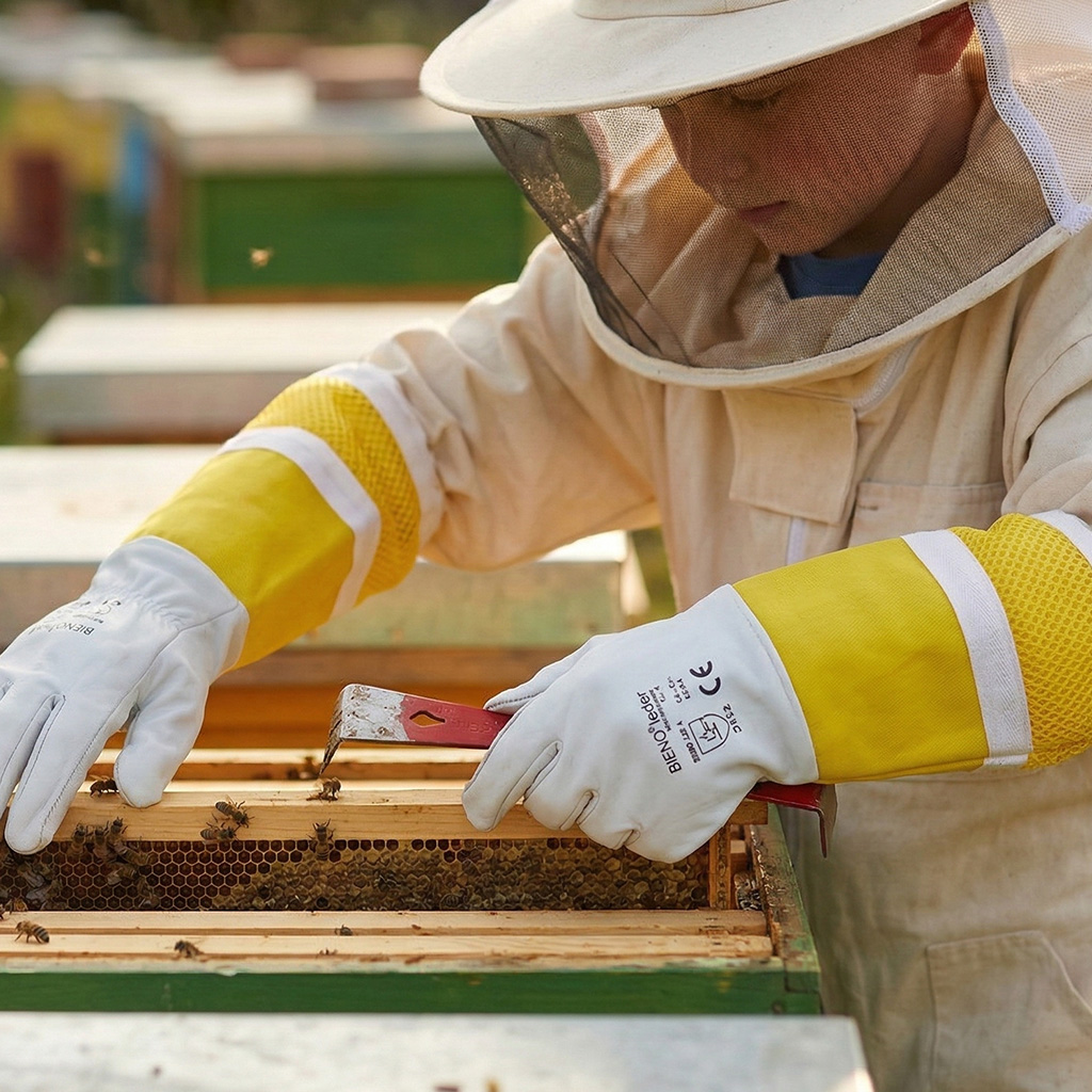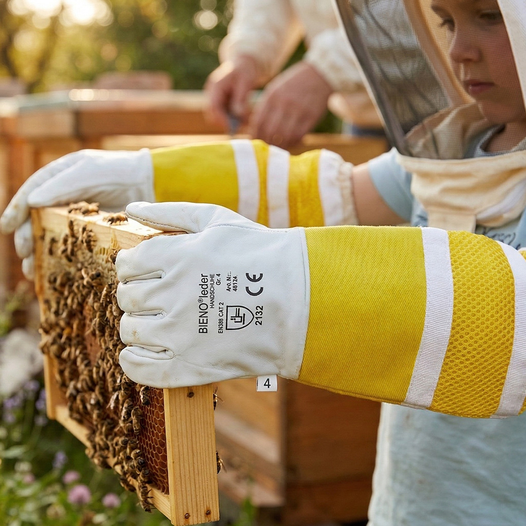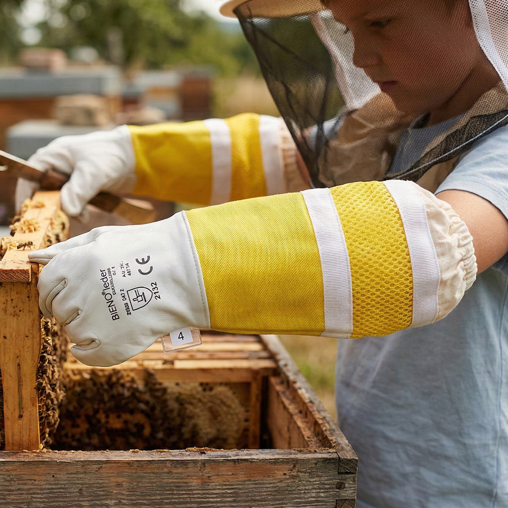 Quando si lavora con le api, è fondamentale non solo la protezione, ma anche il senso di sicurezza – soprattutto per i bambini. Il manicotto tessile melarioto aderisce saldamente all'avambraccio e aiuta a prevenire l'ingresso delle api nella manica. I bambini possono così concentrarsi sulle corrette abitudini durante l'ispezione della famiglia di api e la manipolazione dei telaini, senza essere inutilmente distratti dalla paura delle punture. Guanti ben aderenti favoriscono inoltre un lavoro più tranquillo, che è sempre vantaggioso sia per le api che per l'apicoltore.