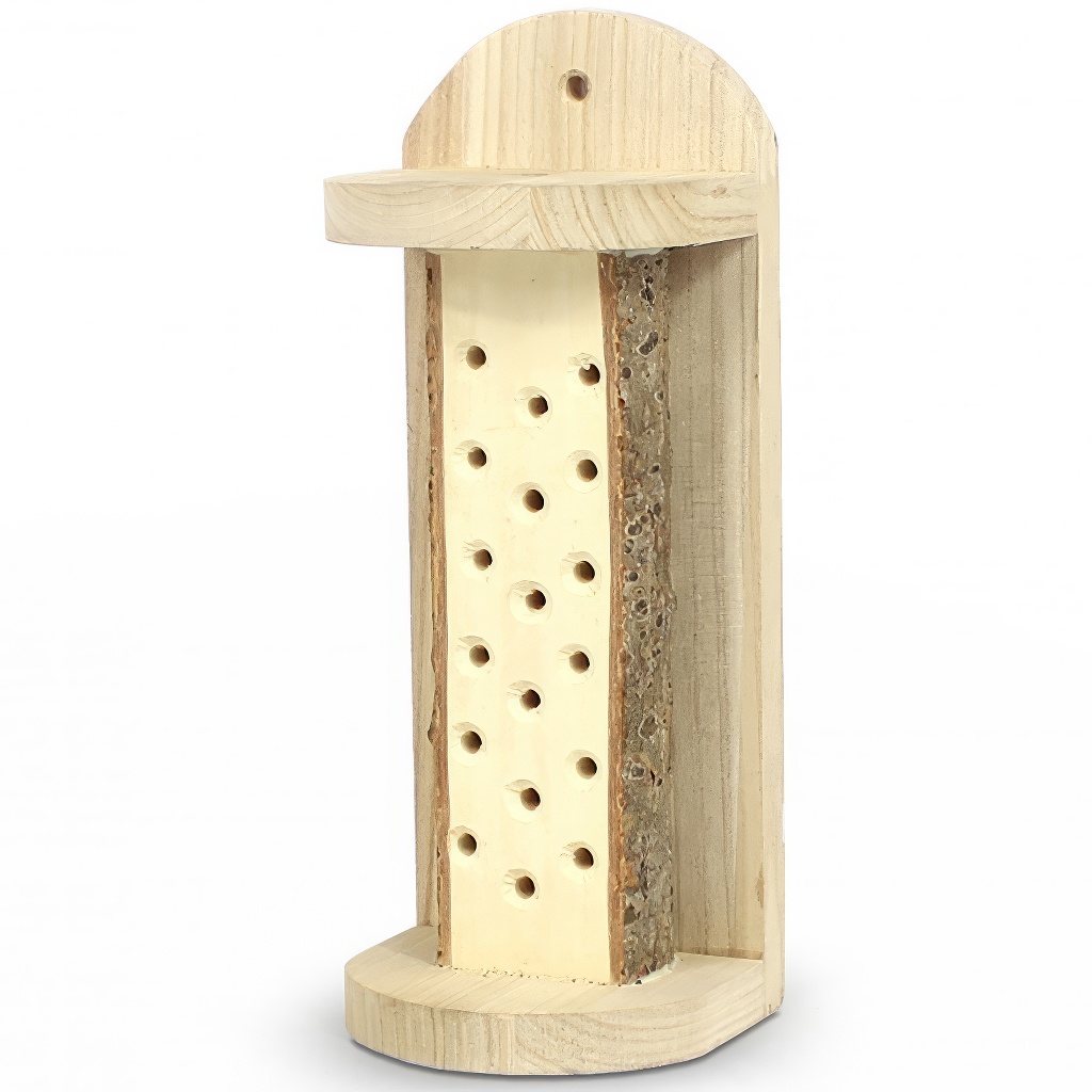 Casetta sospesa per api selvatiche realizzata in legno massello con tetto e pavimento leggermente sporgenti.