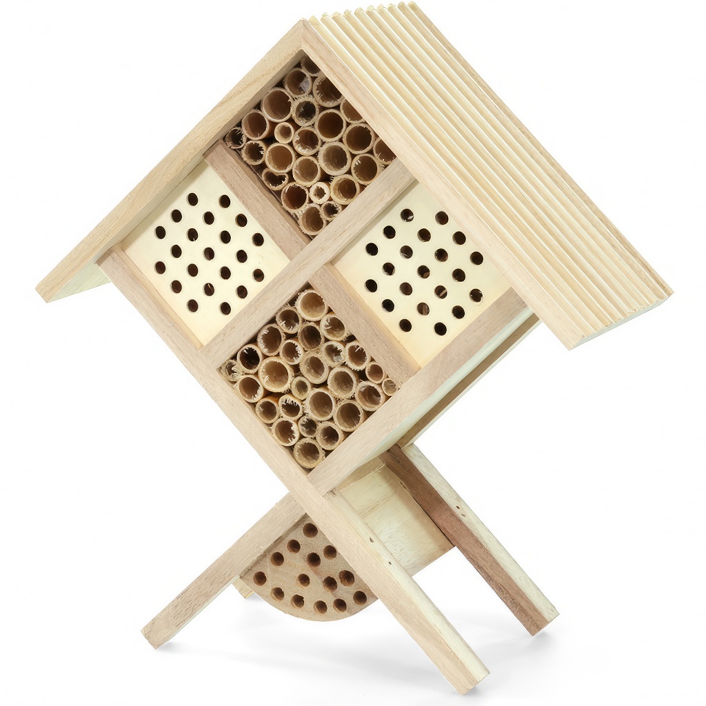Rifugio adatto per api selvatiche, vespe parassite, crisope e coccinelle. Realizzato con materiali naturali come legno e bambù.