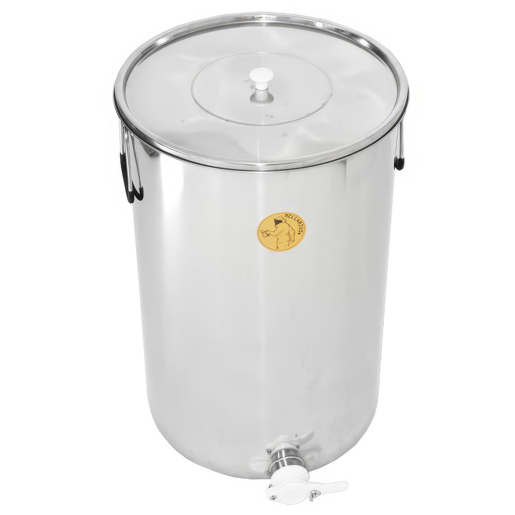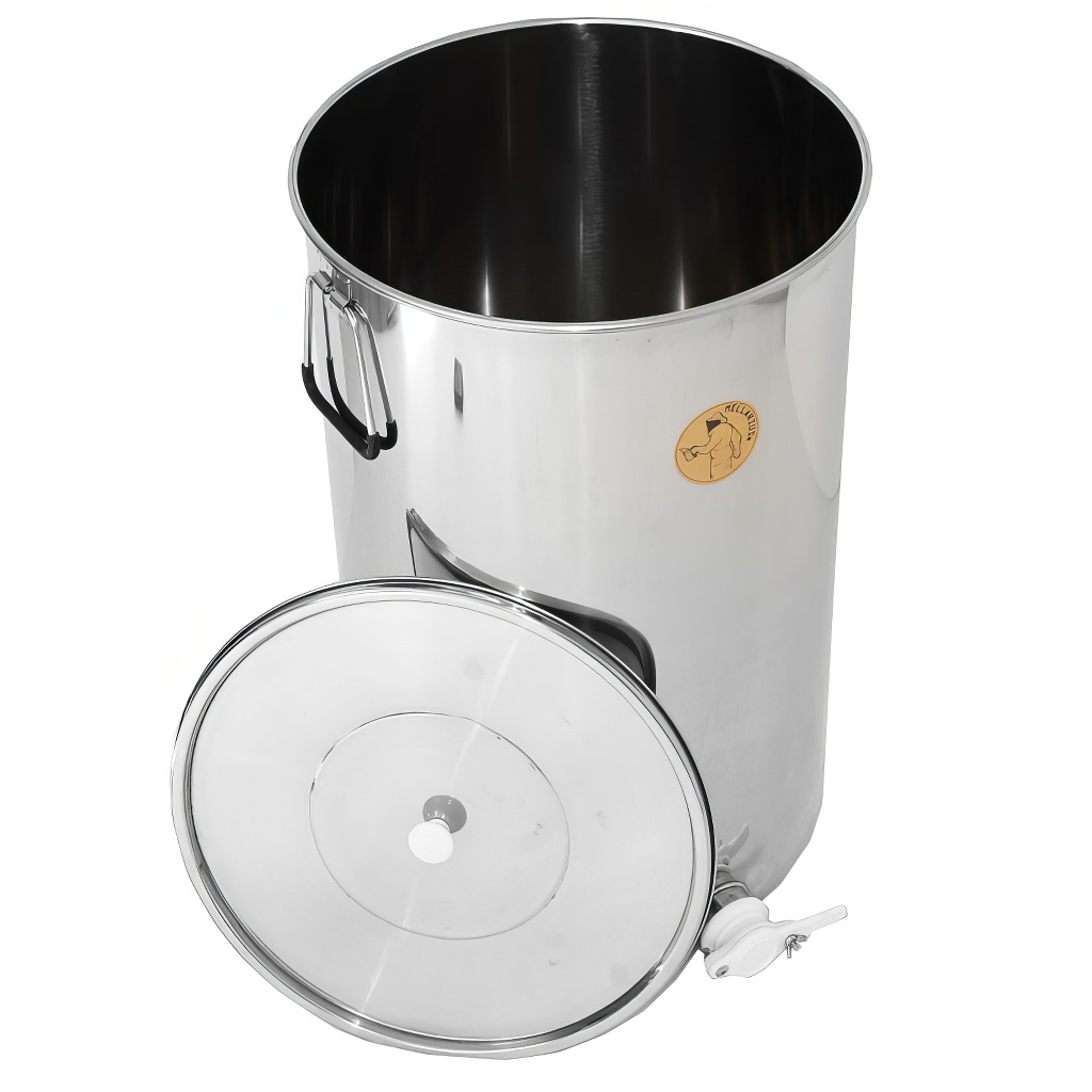 Maturatore in acciaio inox tedesco Mellarius per 100 kg di miele con rubinetto in plastica e coperchio in acciaio inox. Serbatoio di decantazione di qualità con capacità di 100 chilogrammi di miele.