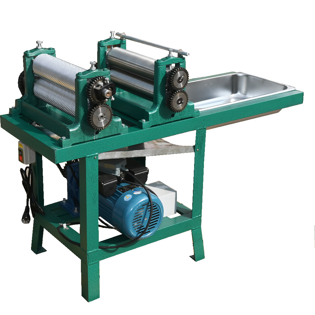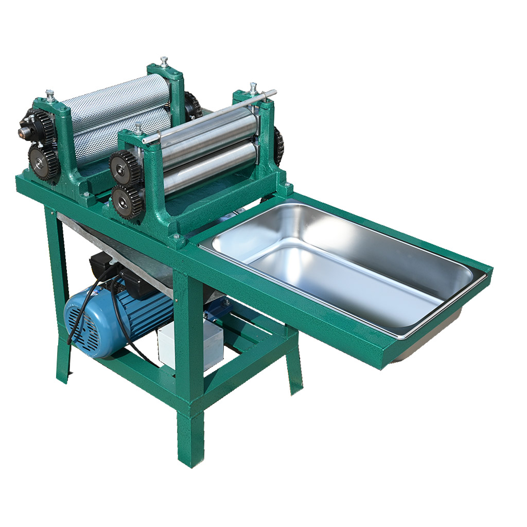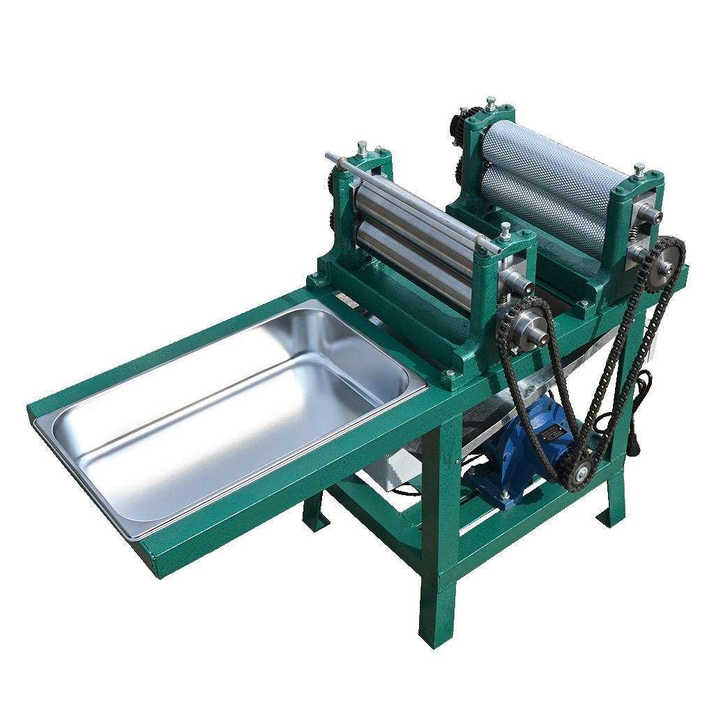 L'attrezzatura è composta da due unità di laminazione separate. La prima unità con rulli lisci serve per la pre-laminazione della cera, la seconda con rulli stampati imprime la perfetta celletta esagonale. Il kit completo è montato su un robusto telaio in acciaio che mantiene la macchina stabile, evitando vibrazioni durante il funzionamento. La vasca in acciaio inox integrata facilita la manipolazione dell'acqua e il deposito delle lastre di cera. Ogni pressa è inoltre dotata di viti di rettifica per una regolazione molto fine e precisa dello spessore del foglio cereo secondo le vostre esigenze.