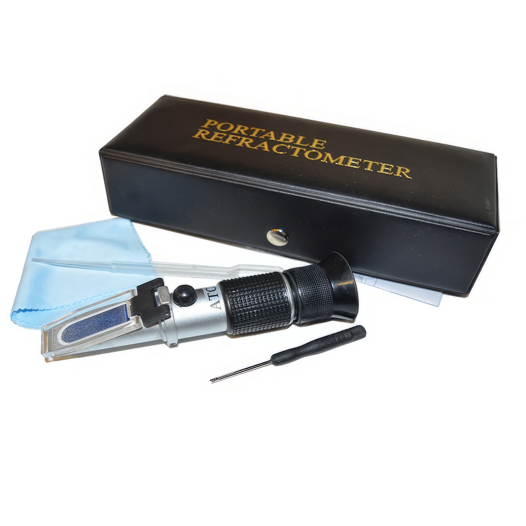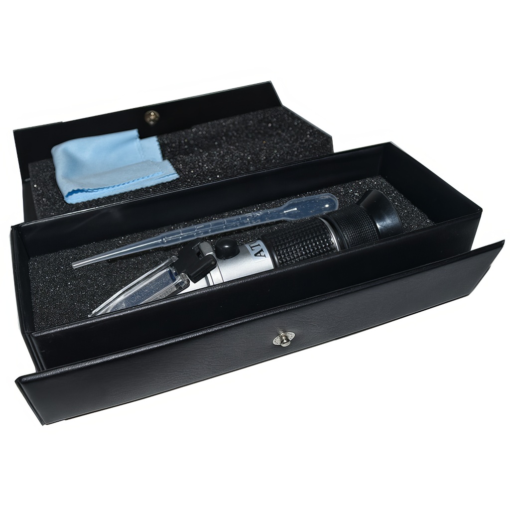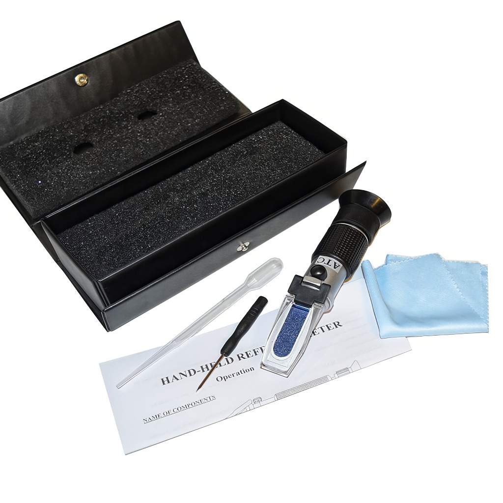 Il rifrattometro è uno strumento ottico di precisione, quindi merita un trattamento delicato. Dopo ogni misurazione sciacquate il prisma con acqua tiepida, asciugate delicatamente con un panno morbido. Non sciacquate lo strumento sotto l'acqua corrente e non immergetelo – l'acqua potrebbe entrare nella parte ottica. Il rifrattometro è solitamente calibrato dalla fabbrica. Il liquido di calibrazione non è incluso nella confezione, ma per l'uso normale generalmente non ne avete bisogno fin dall'inizio.