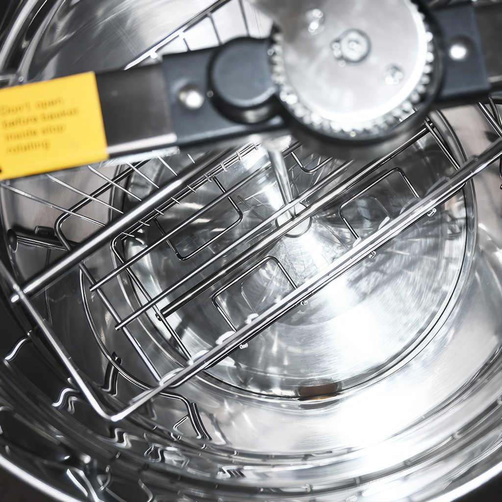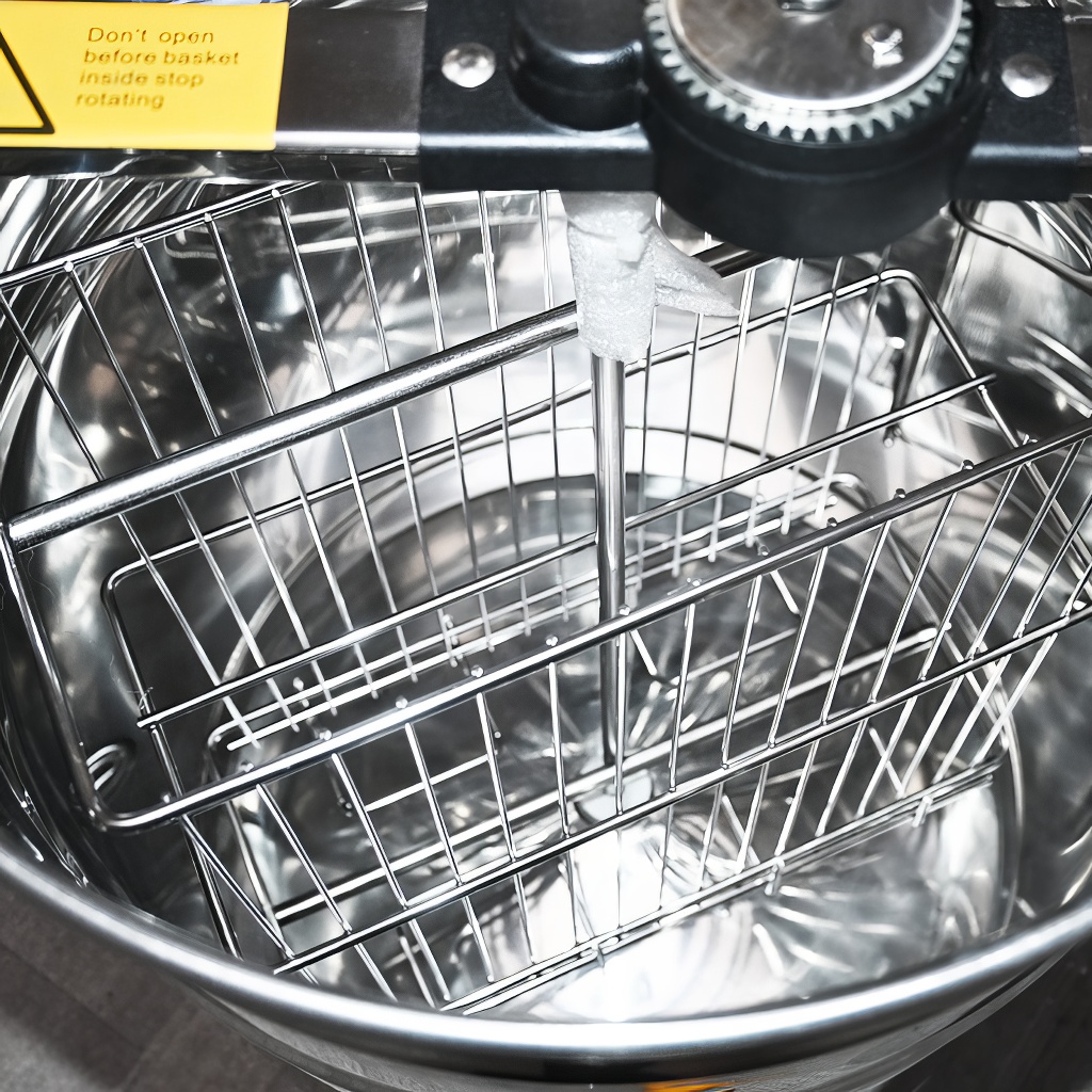 Il sistema di azionamento è sempre posizionato nella parte superiore dello smielatore, il che offre la possibilità di una facile manutenzione. Grazie a questa soluzione, il cestello dello smielatore è liberamente posizionato su un cuscinetto a sfera nella parte inferiore. L'azionamento è posizionato su una barra di fissaggio, sulla quale si trovano anche ampie cerniere per i coperchi in plexiglass. La barra di fissaggio con l'azionamento è sufficientemente massiccia, sempre in materiale inossidabile lucidato, per una facile manutenzione. Dopo aver rimosso la barra superiore con l'azionamento, che è fissata con due viti a stella, è possibile rimuovere facilmente l'intero azionamento. Allo stesso modo, è possibile estrarre facilmente l'intero cestello dallo smielatore e pulire facilmente sia lo smielatore che il cestello separatamente.
