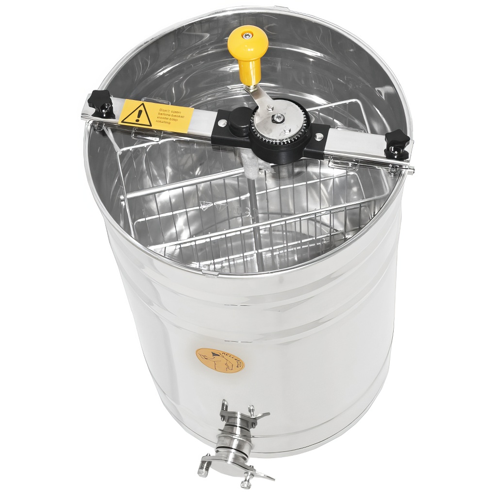 Smielatore tangenziale a due telaini con azionamento manuale. La larghezza del cestello è di 34 cm, quindi lo smielatore è adatto per la maggior parte dei telaini. Questi smielatori sono destinati agli apicoltori principianti, le cui esigenze per uno smielatore sono basse e quindi non vogliono investire troppi soldi nel suo acquisto.