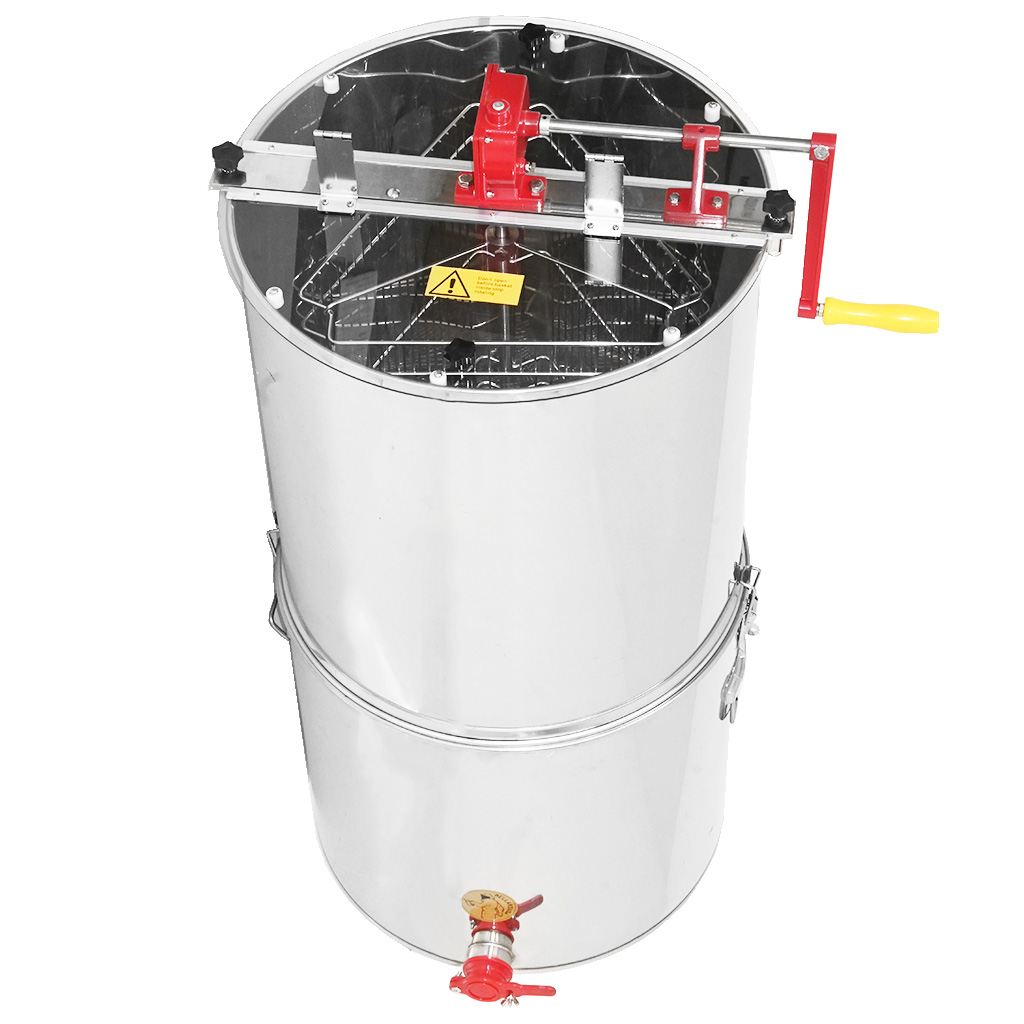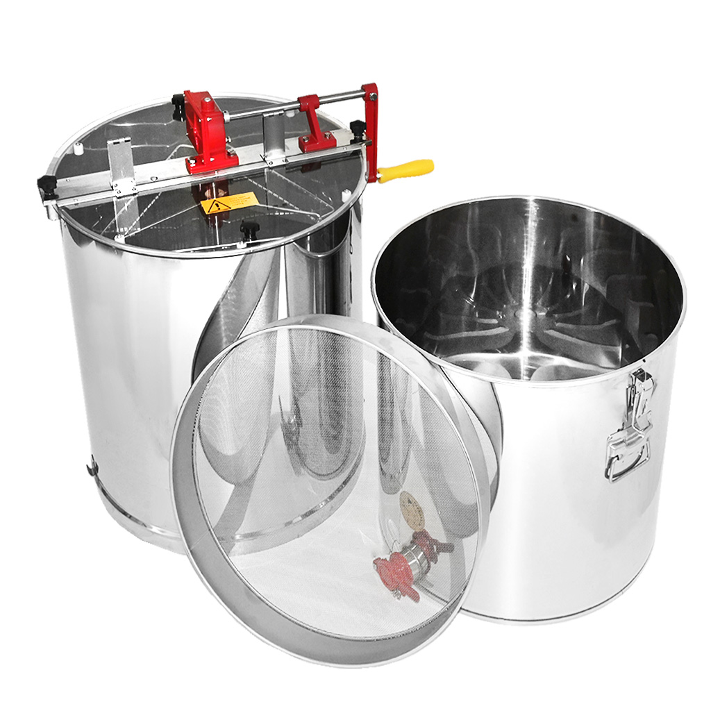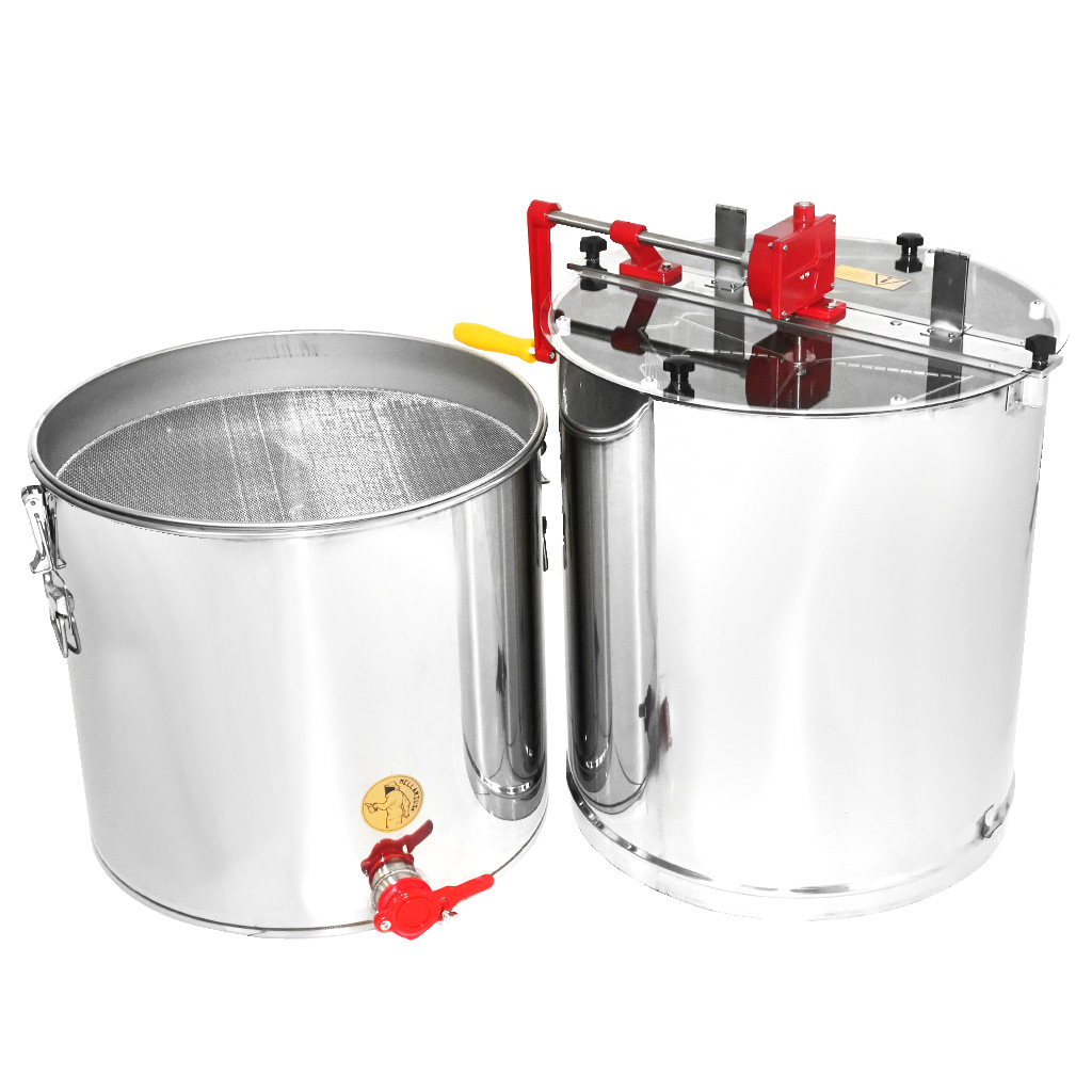 Smielatore tangenziale per tre telaini con proprio contenitore e filtro. La larghezza del cestello è di 34 cm, lo smielatore è quindi adatto per la maggior parte dei telaini o due melari da nido. Il vantaggio di questa soluzione è il filtro e il contenitore integrati, dove in un unico dispositivo si ottiene tutto il necessario per l'estrazione, la filtrazione e lo stoccaggio del miele.