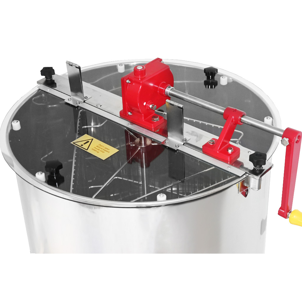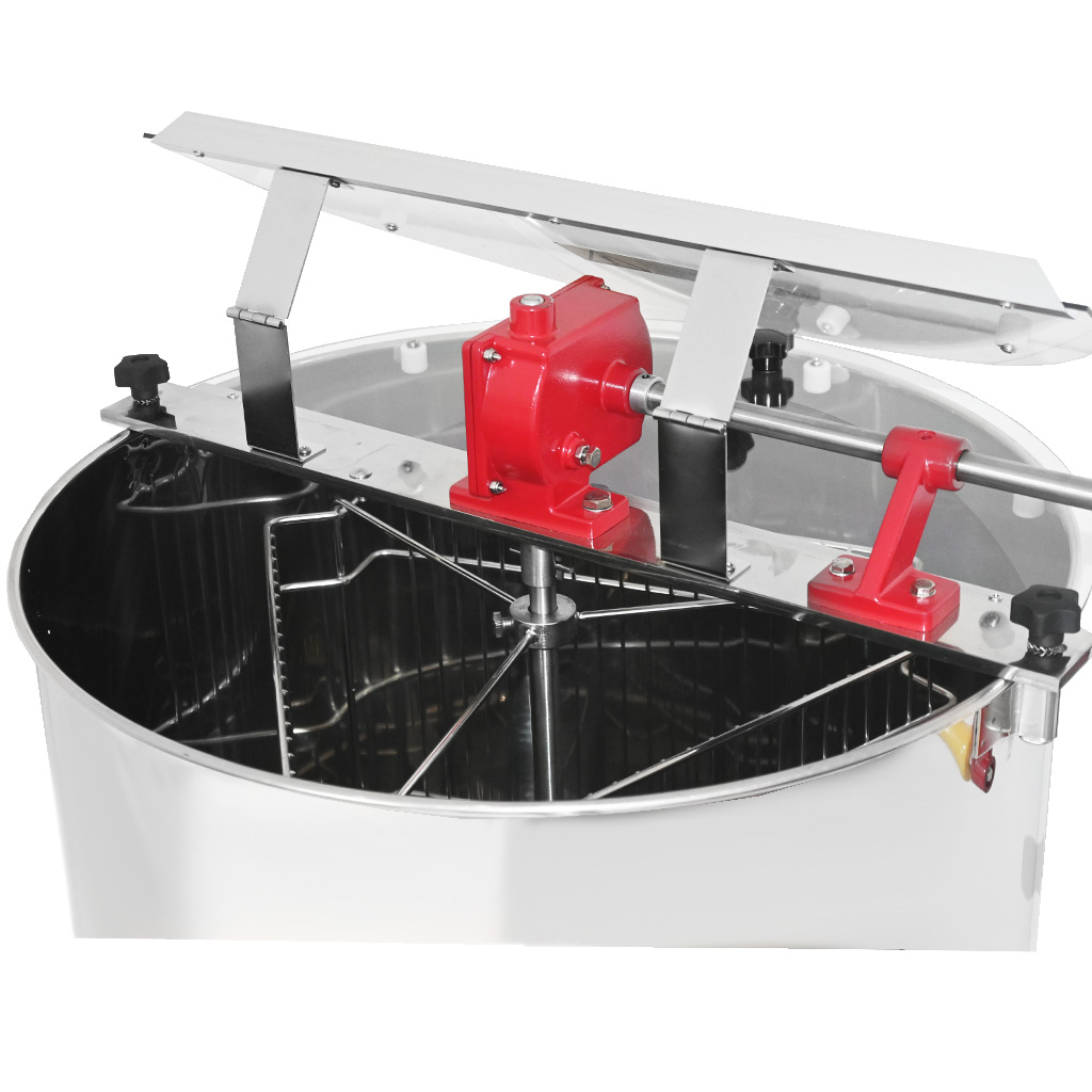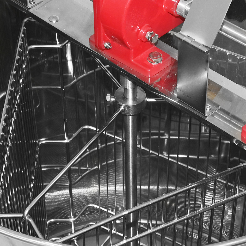 Smielatore tangenziale per tre telaini con proprio contenitore e filtro. La larghezza del cestello è di 34 cm, lo smielatore è quindi adatto per la maggior parte dei telaini o due melari da nido. Il vantaggio di questa soluzione è il filtro e il contenitore integrati, dove in un unico dispositivo si ottiene tutto il necessario per l'estrazione, la filtrazione e lo stoccaggio del miele.