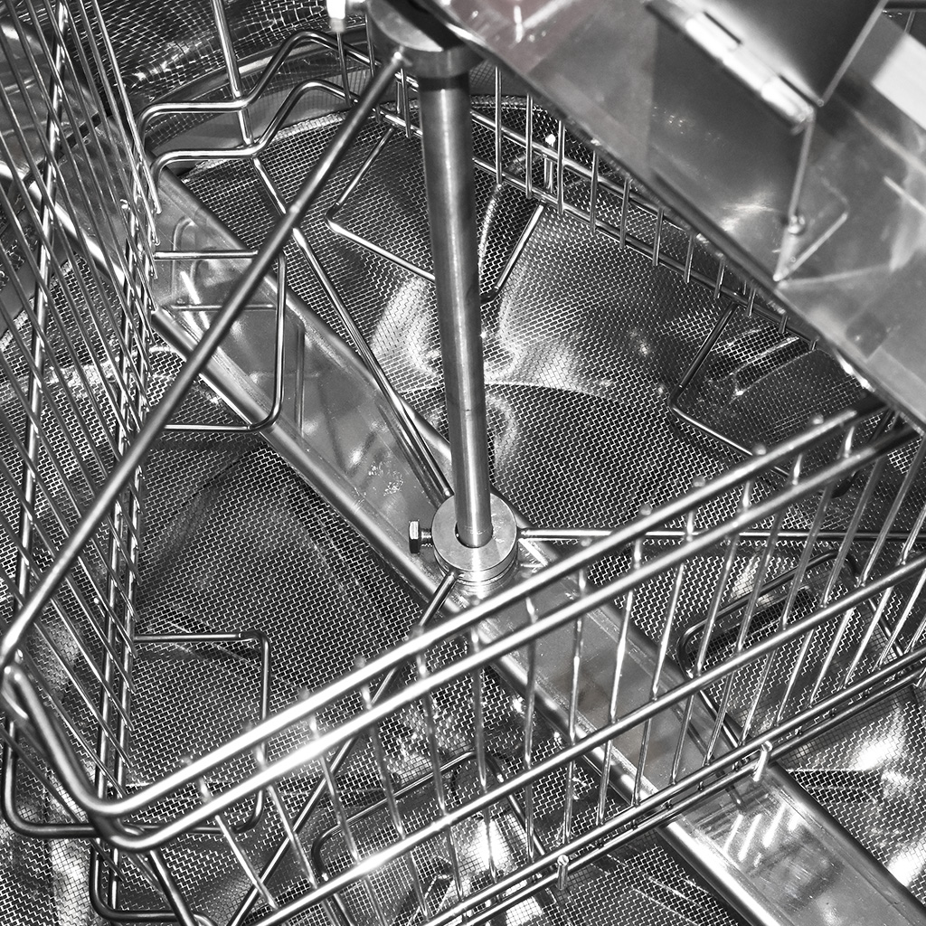 Il sistema di trasmissione è sempre posizionato nella parte superiore dello smelatore, il che offre la possibilità di una facile manutenzione. Grazie a questa soluzione, il cestello dello smelatore nella parte inferiore è liberamente posizionato su un cuscinetto a sfera. La trasmissione è posizionata su una barra di fissaggio, sulla quale si trovano anche ampie cerniere per i coperchi in plexiglass. La barra di fissaggio con la trasmissione è sufficientemente massiccia, sempre in materiale inox lucidato, per una facile manutenzione. Dopo aver rimosso la barra superiore con la trasmissione, che è fissata con due viti a stella, l'intera trasmissione può essere facilmente rimossa. Allo stesso modo, è possibile estrarre facilmente l'intero cestello dallo smelatore e pulire facilmente sia lo smelatore che il cestello separatamente.
