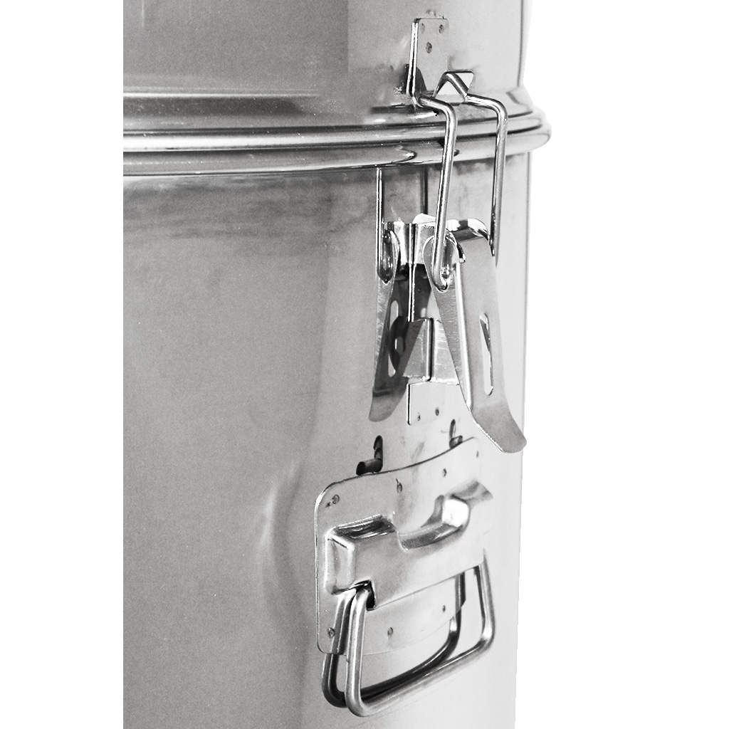 Smelatore tangenziale a tre telaini con proprio contenitore e filtro. Lo smelatore è saldamente collegato al contenitore tramite morsetti. Tra lo smelatore e il contenitore c'è un grande filtro con diametro di 52 cm. La larghezza del cestello è di 34 cm, quindi lo smelatore è adatto per la maggior parte dei telaini. Il vantaggio di questa soluzione è il filtro e il contenitore integrati, dove in un unico dispositivo si ottiene tutto il necessario per l'estrazione, la filtrazione e lo stoccaggio del miele.
