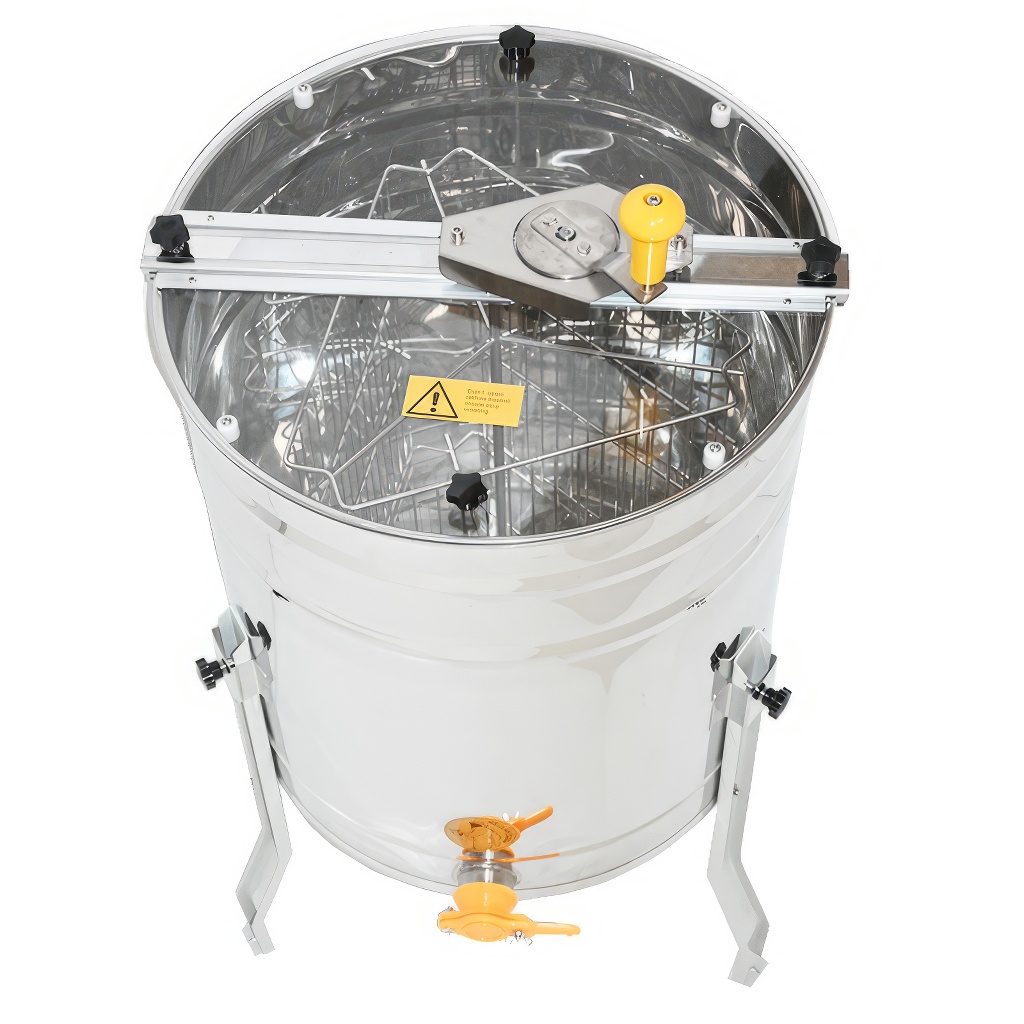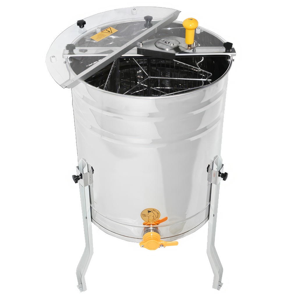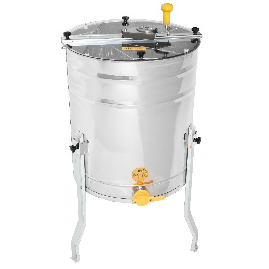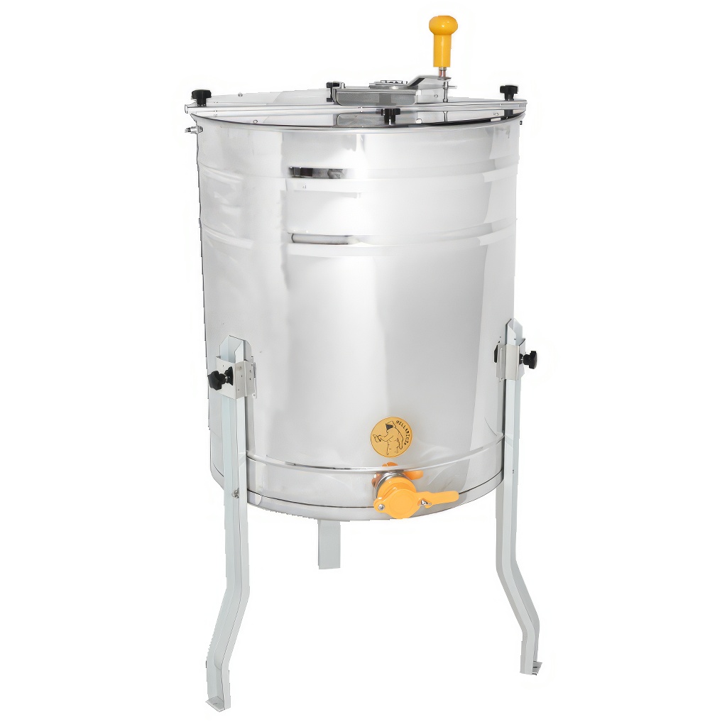 Smielatore tangenziale a tre telaini con azionamento manuale. La larghezza del cestello è di 34 cm, lo smielatore è quindi adatto per la maggior parte dei telaini. Questi smielatori sono destinati agli apicoltori principianti, le cui esigenze per uno smielatore sono basse e quindi non vogliono investire troppi soldi nel suo acquisto.