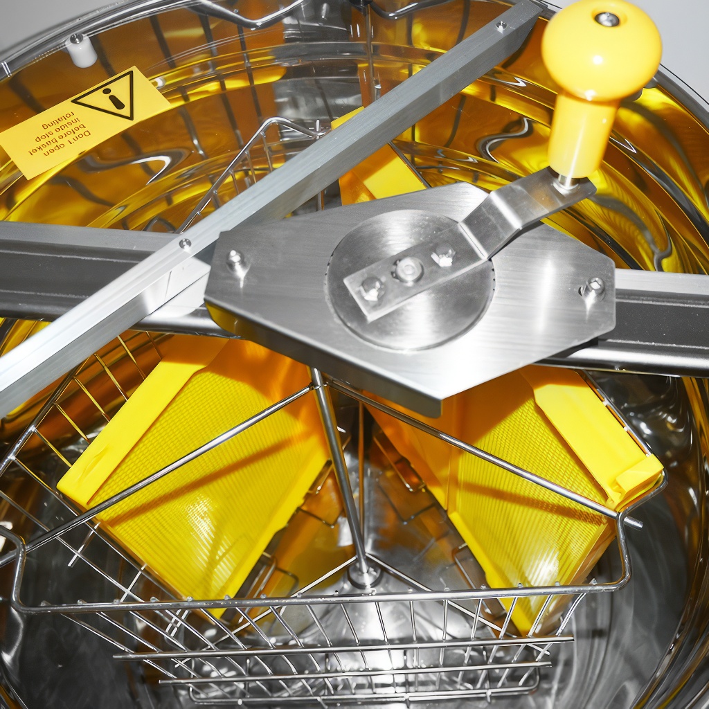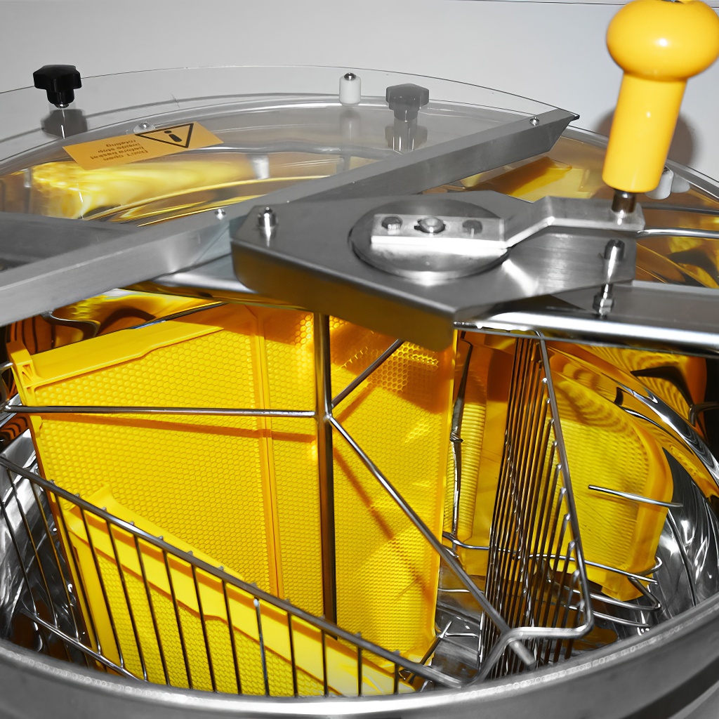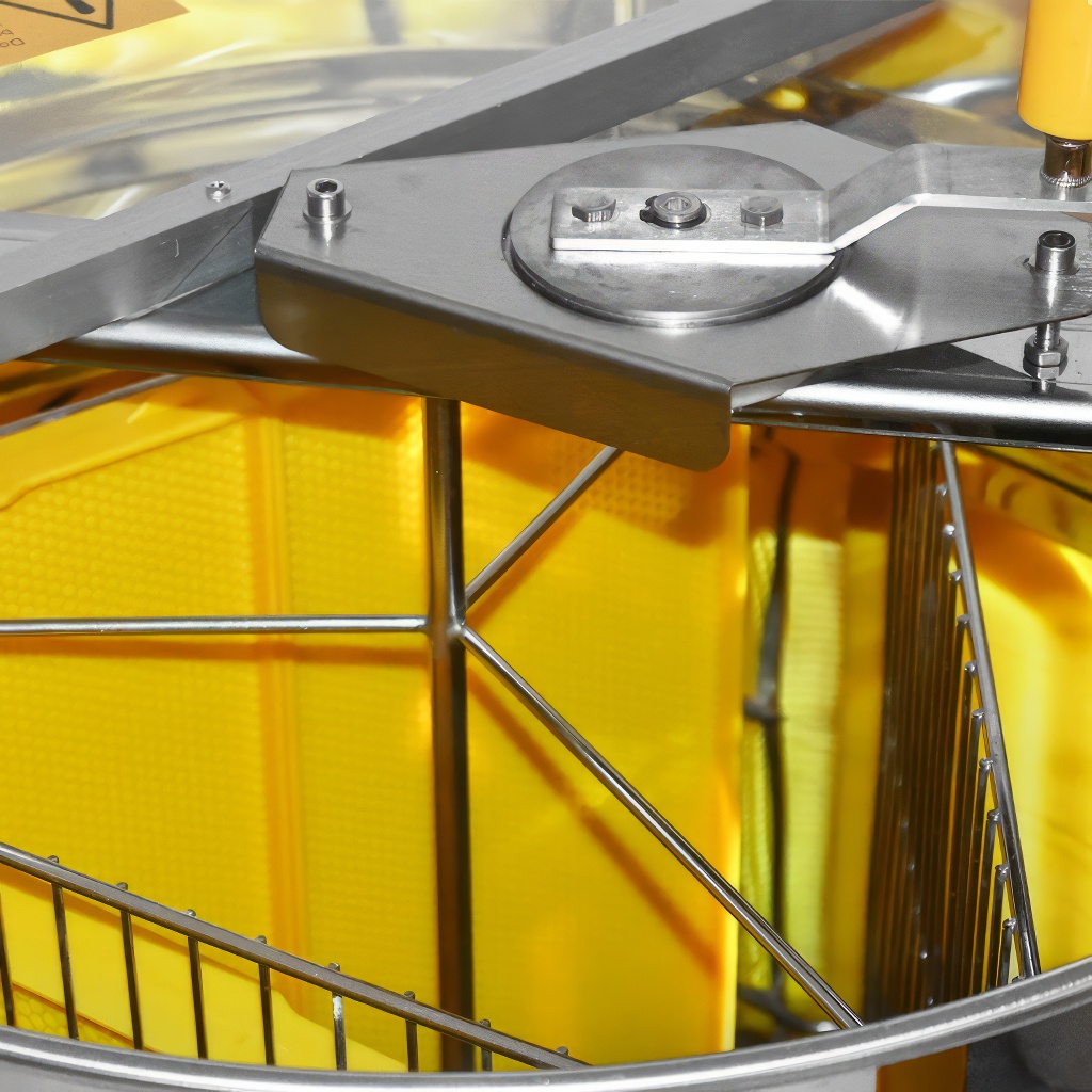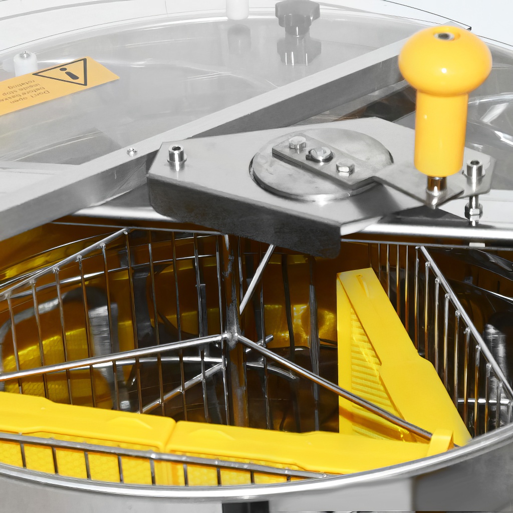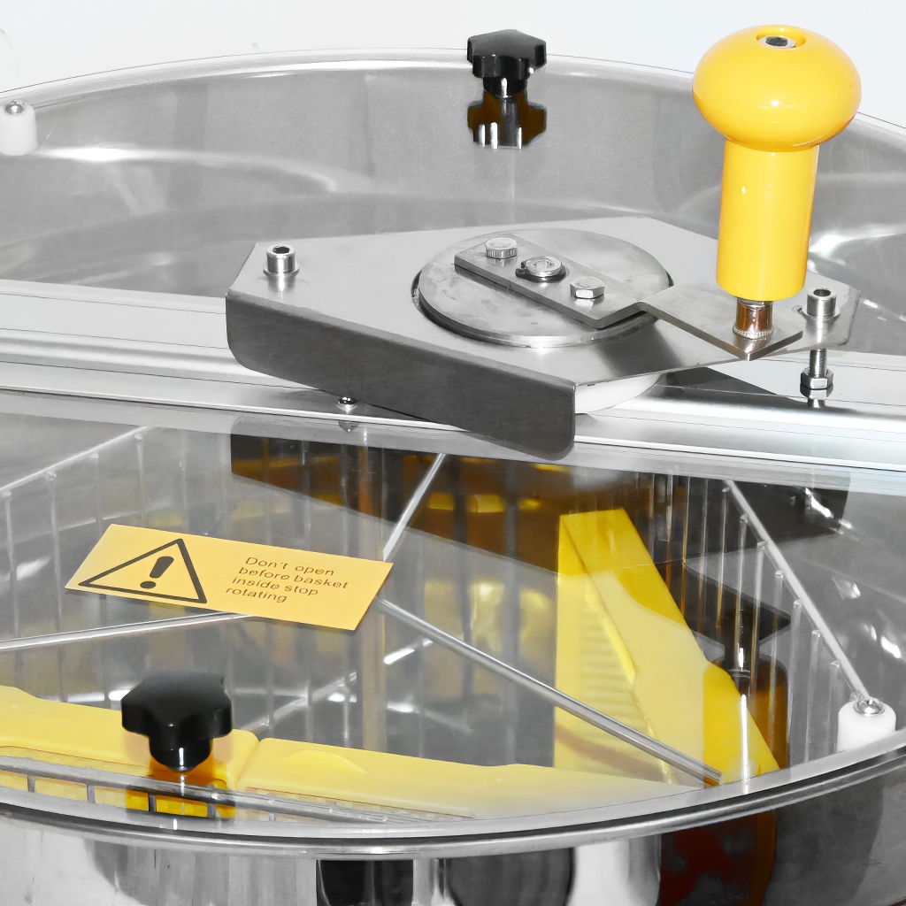 Smielatore tangenziale a tre telaini con azionamento manuale. La larghezza del cestello è di 34 cm, lo smielatore è quindi adatto per la maggior parte dei telaini. Questi smielatori sono destinati agli apicoltori principianti, le cui esigenze per uno smielatore sono basse e quindi non vogliono investire troppi soldi nel suo acquisto.