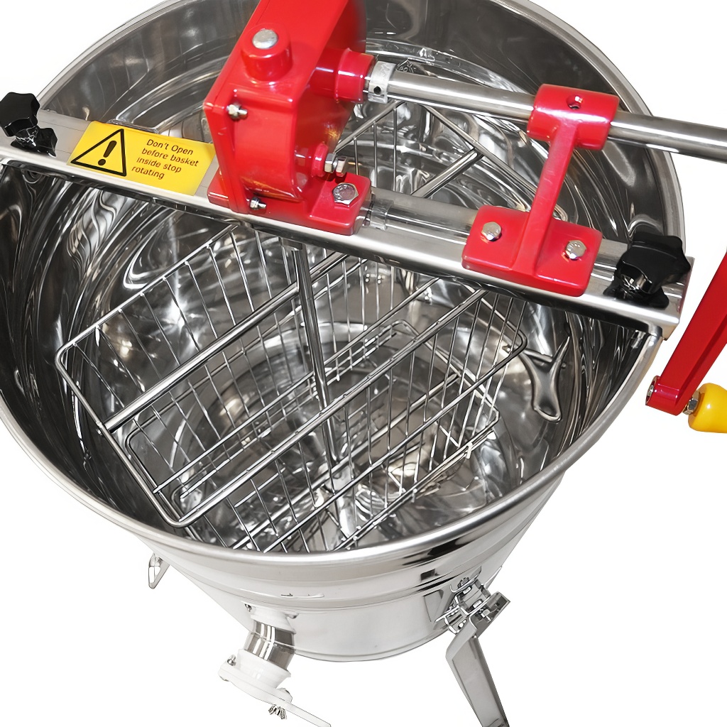 Smielatore tangenziale a due telaini con azionamento manuale, dotato di ruota libera e freno. La larghezza del cestello è di 33 cm. Lo smielatore è realizzato in lamiera di acciaio inossidabile lucidato, conforme alle certificazioni per il contatto con gli alimenti. Versione di alta qualità con fondo conico e molti altri elementi innovativi.