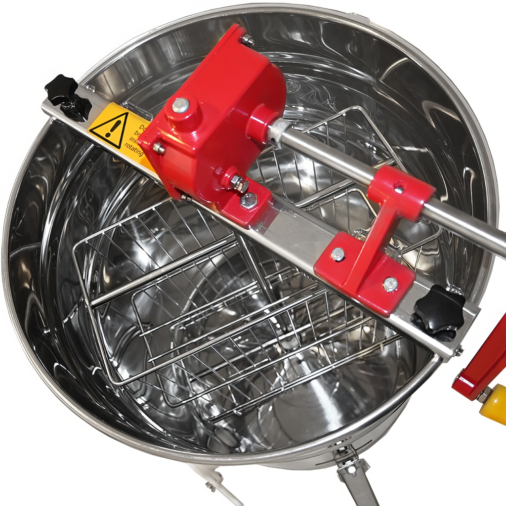 Smelatore tangenziale a due telaini con azionamento manuale. La larghezza del cestello è di 33 cm, quindi lo smelatore è adatto per la maggior parte dei telaini. Lo smelatore è realizzato in lamiera di acciaio inossidabile lucidato, conforme alle certificazioni per il contatto con gli alimenti.