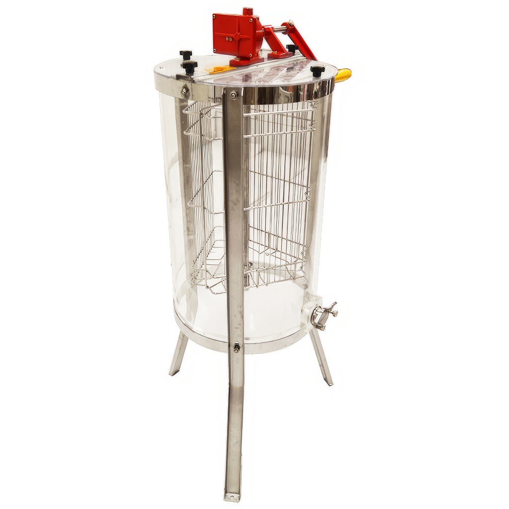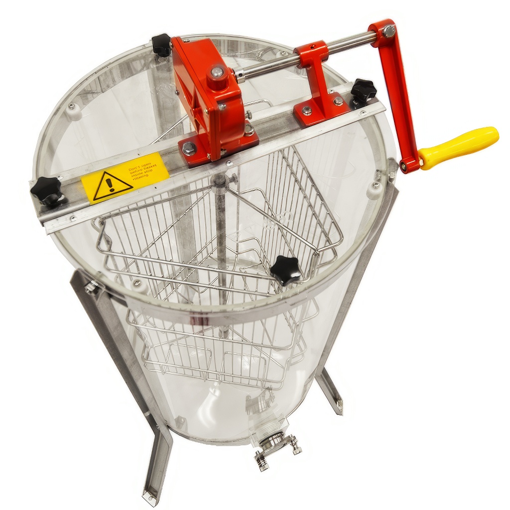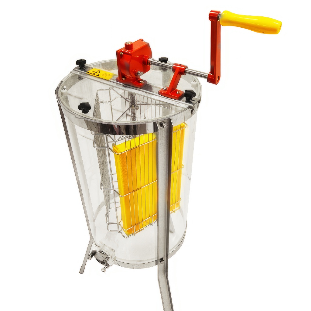Smielatore tangenziale a tre telaini, con tutto il rivestimento realizzato in plexiglass ad alta resistenza. Ideale per l'insegnamento, i circoli apistici per bambini, le esposizioni e ovunque ci siano spettatori durante l'estrazione del miele.