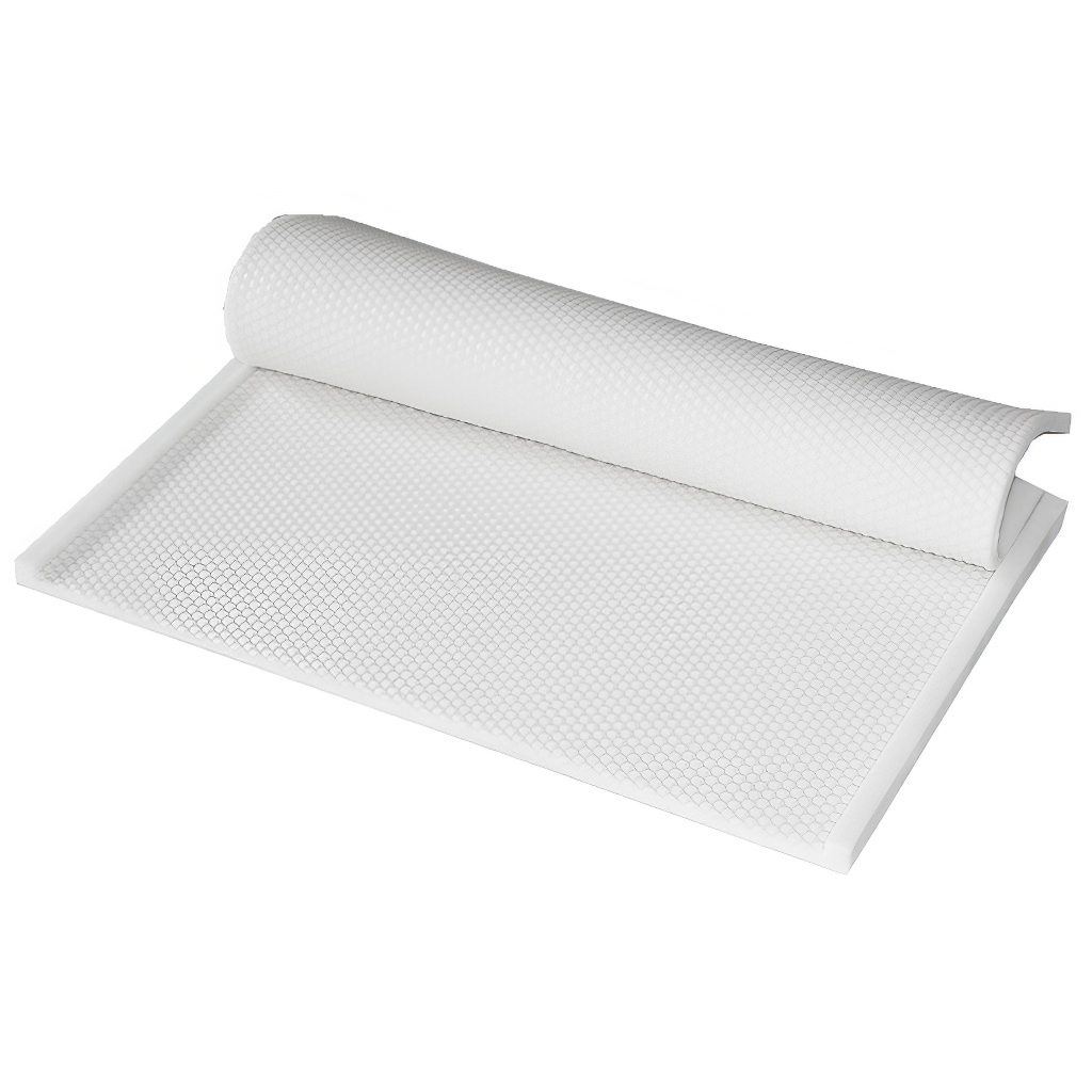Lo stampo è realizzato in silicone flessibile di qualità, che resiste alla temperatura della cera fusa e facilita l'estrazione del foglio cereo finito. Il silicone ha proprietà naturalmente antiaderenti, quindi la cera aderisce minimamente alla superficie e il lavoro è più veloce. Il rilievo dello stampo riproduce fedelmente la struttura cellulare del favo (dimensione standard della cella), aiutando così le api nell'accettazione del foglio cereo e nella successiva costruzione.