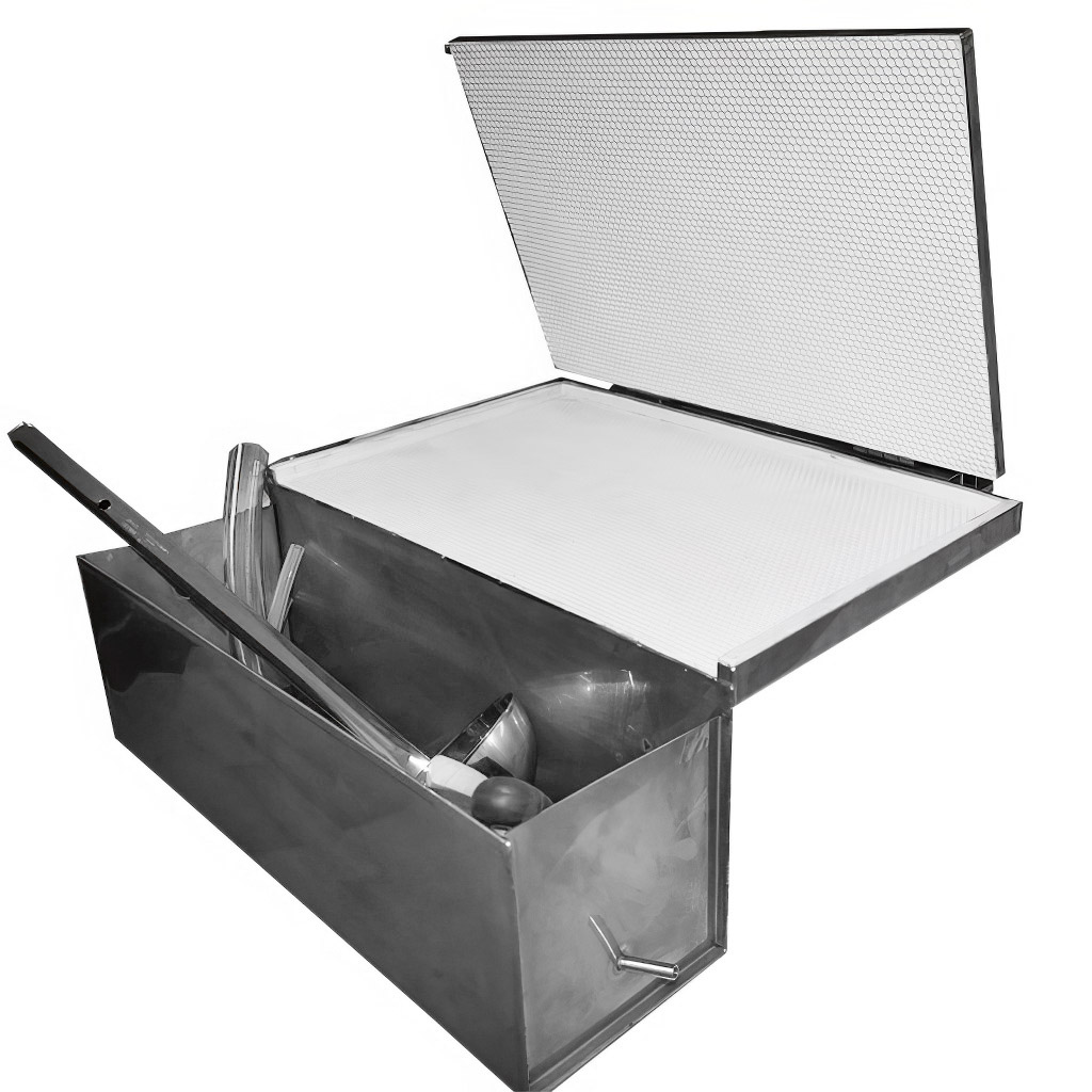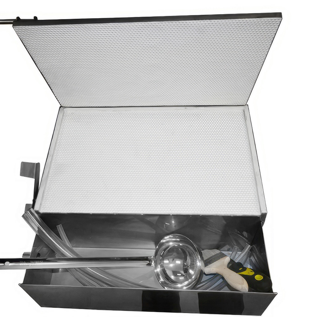 La torchio pressa manuale per fogli cerei con raffreddamento ad acqua e matrice in silicone è un attrezzo pratico per gli apicoltori che vogliono lavorare la propria cera e avere la produzione di fogli cerei completamente sotto controllo. Il raffreddamento è realizzato nella parte superiore dello stampo con collegamento diretto all'acqua, grazie al quale il foglio cereo si solidifica più rapidamente, la pressatura procede meglio e il lavoro ha un ritmo più veloce. La cera in eccesso scorre in una vaschetta integrata, così il materiale prezioso non finisce sul tavolo e l'ambiente circostante rimane pulito. Le dimensioni dello stampo 420 × 205 mm sono adatte alla maggior parte delle misure dei telai comunemente utilizzati. La pressa viene fornita come kit pronto all'uso comprensivo di spatola in acciaio inox, mestolo, pennello e tubi per il raffreddamento.