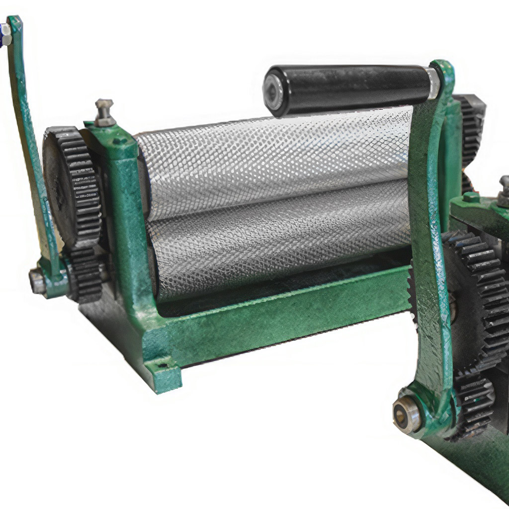 Torchio pressa manuale per fogli cerei con rulli incisi, utilizzati per la pressatura finale dei fogli cerei.