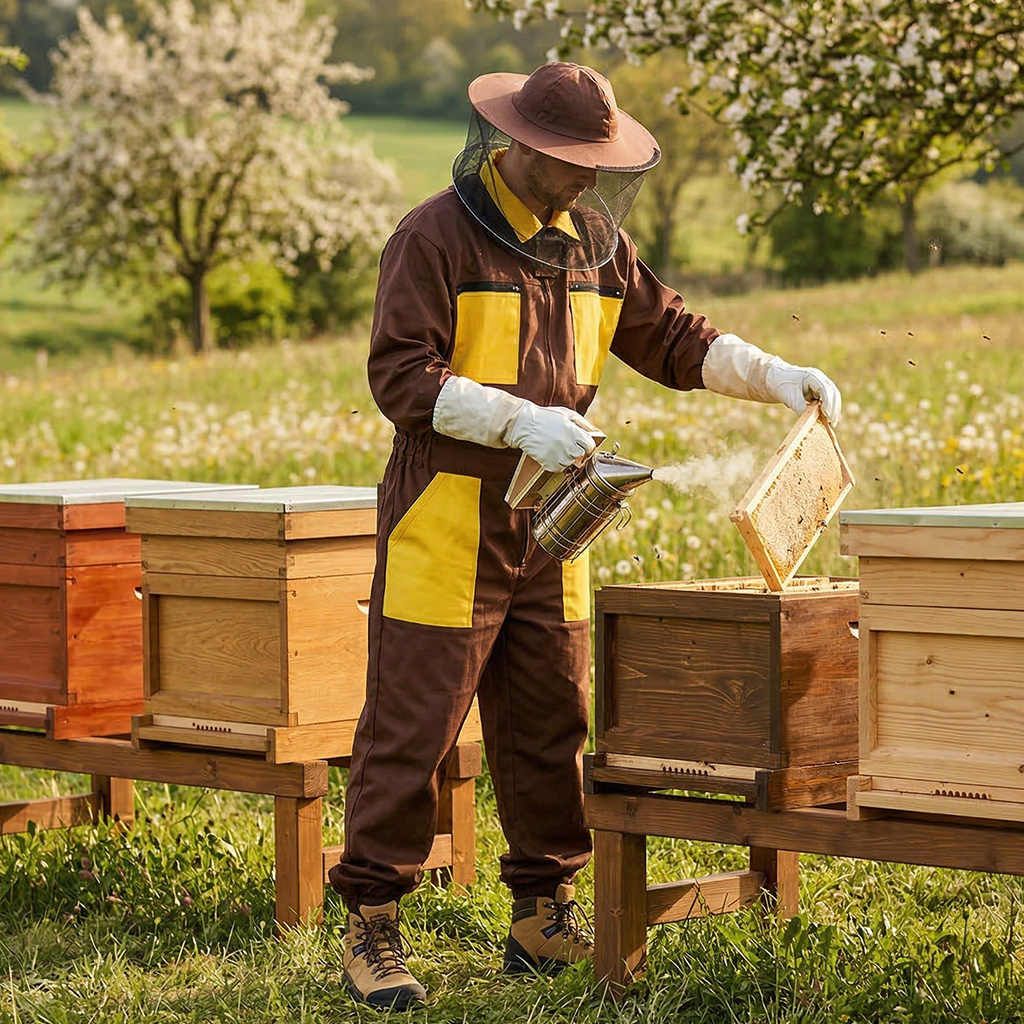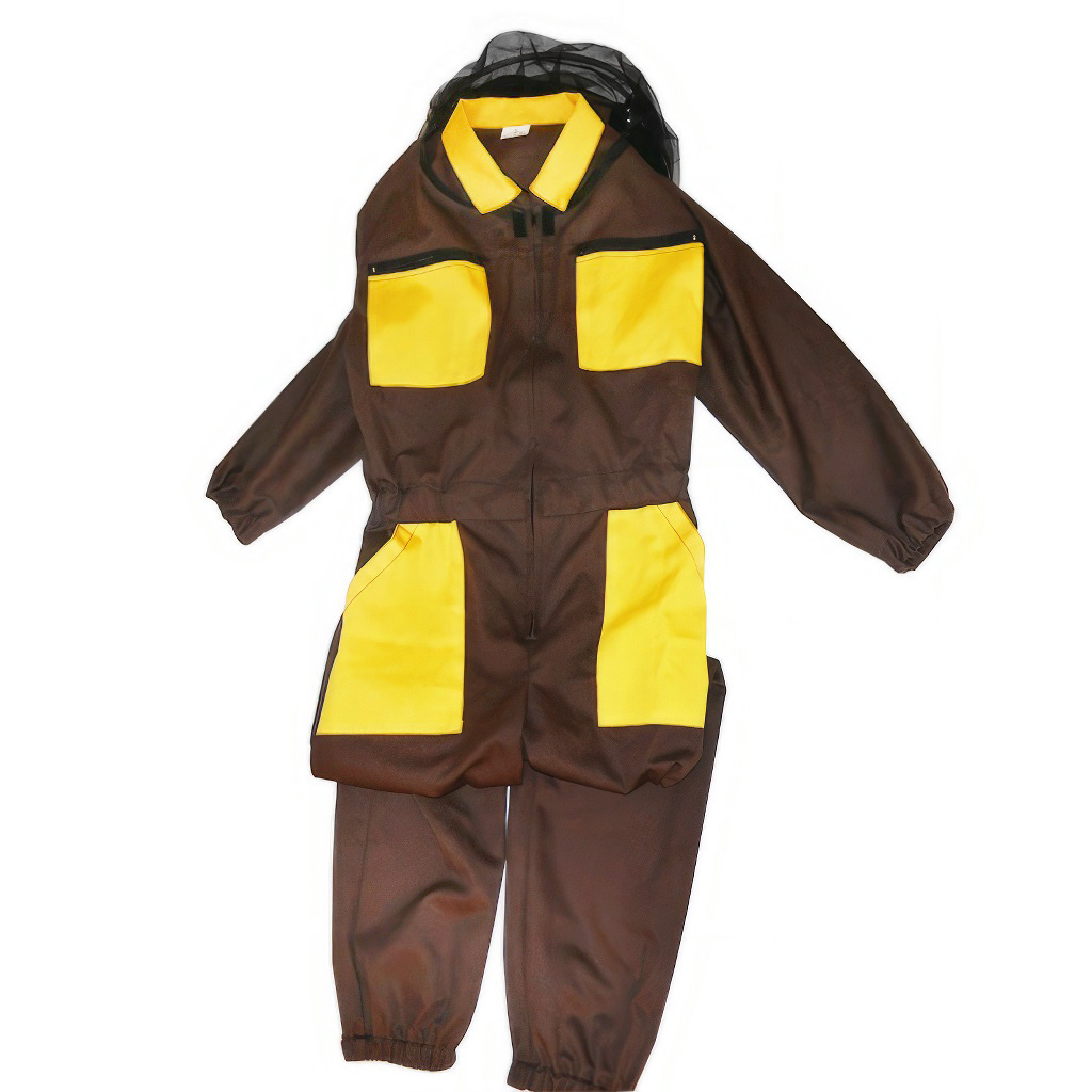 La tuta da apicoltura colorata con cappello rappresenta una base affidabile per lavorare con le api in modo sereno e sicuro. Durante le ispezioni delle famiglie di api è necessario avere le mani e la testa libere, senza dover costantemente controllare da dove potrebbe arrivare una puntura. Questo indumento protettivo integrale è progettato per proteggere dalla testa ai piedi, senza tuttavia limitare i movimenti durante la manipolazione dei telaini, dei melari o durante il lavoro in apiario. La colorazione marrone-gialla risulta naturale e si integra perfettamente nell'ambiente della postazione apistica.