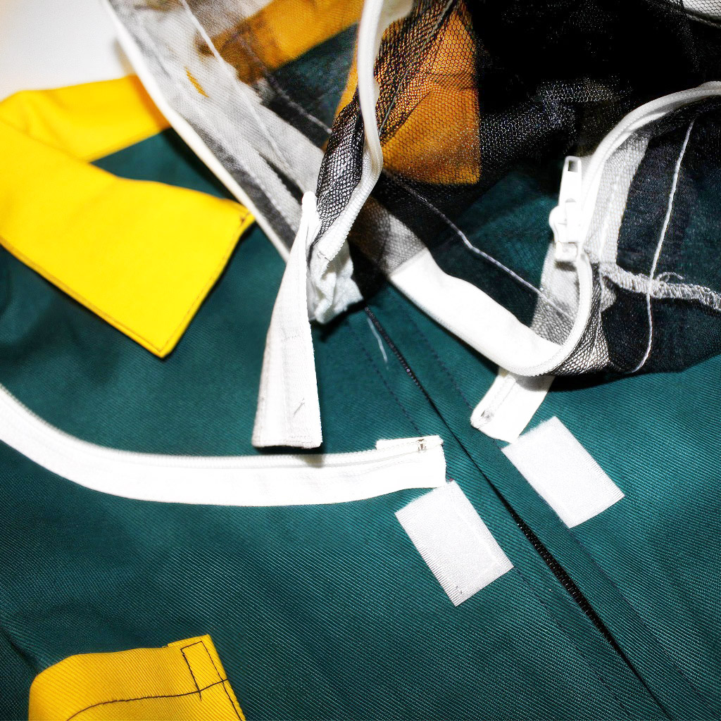 La tuta è realizzata in tessuto di cotone di qualità, piuttosto rigido. Il cotone è apprezzato in apicoltura per la sua traspirabilità, particolarmente gradita nelle giornate calde, e allo stesso tempo, grazie alla grammatura elevata, offre una buona protezione contro la penetrazione del pungiglione. Il cappello protegge la testa e il viso ed è collegato alla casacca tramite una cerniera. Questo è pratico durante le pause, gli spostamenti tra le postazioni o in qualsiasi momento in cui è necessario staccare o ribaltare rapidamente il cappello senza dover togliere l'intero indumento.